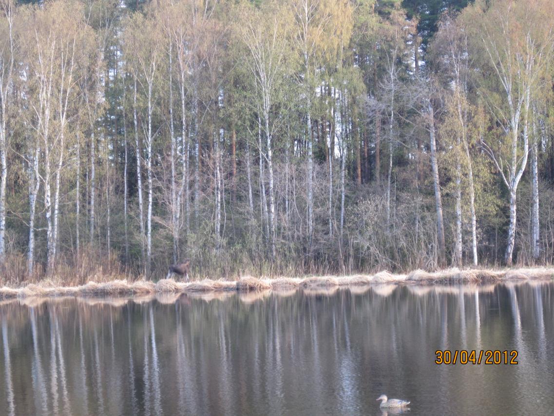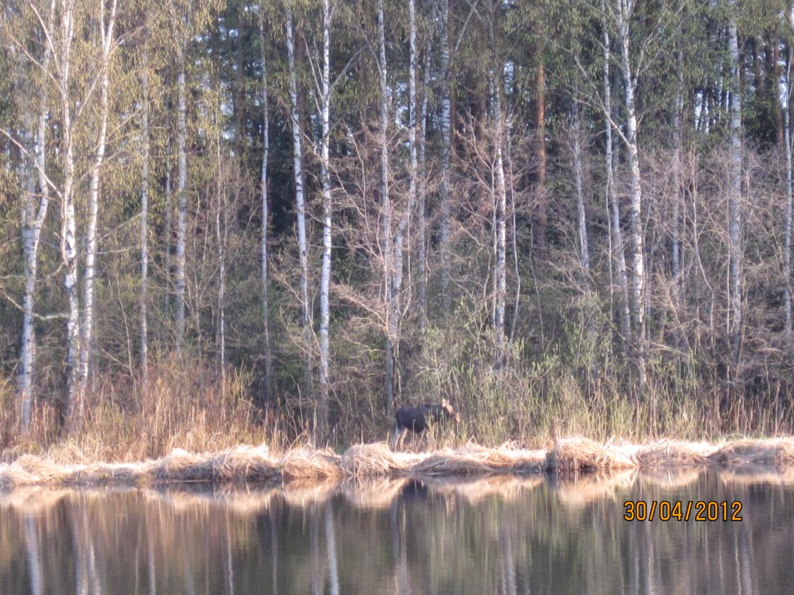 Это фото, а есть и видеоролик, который снял на фотоаппарат. Так вот, за этим кормящимся лосиком наблюдал минут 7-8, до того момента пока он не начал двигаться по кромке тростника. Пришлось пару-тройку раз крикнуть. Интересно было наблюдать за его реакцией. Лось долго не мог понять откуда доносится крик, т.к. голос отражался от леса и сбивал его с толку.