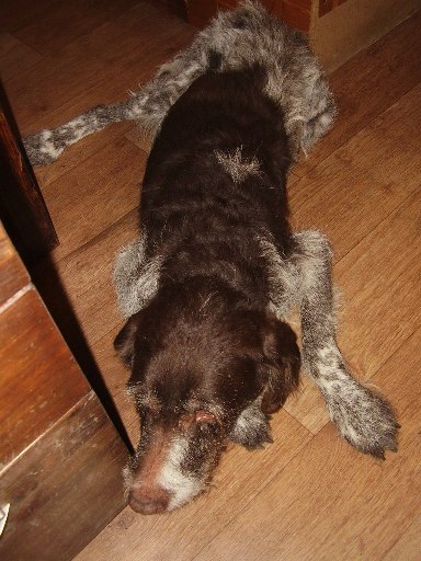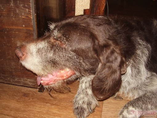 Клейма нет, хвост не купирован, кобель не кастрирован и сильно истощен.