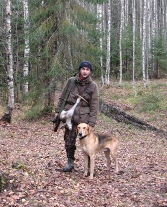 Неделю охотился в Карелии- 3 дня за Свирью, 2 дня под Алеховщиной. В целом нормально, зайцев добыл. Погода в начале была не очень, потом распогодилось. Когда за Свирью собак набрасывал погода была не очень- ветер, дождь, гон не слышно, заяц наполовину затерся, лежит плотно, под гончими держится далеко, старается отдалеть, накидает двоек и ложится. Жировки небольшие, как после пороши, и ложится рядом. Так что если жировку нашли- заяц будет. В общем за Свирью поохотился так себе- но собакам полезно. Зайца добыл неинтересно- иду под гон, а он по дорге чешет- напустил поближе, стреляю- бежит, стреляю второй раз (обычно кладу с первого выстрела, ружье взял другое), подкинуло ему немного зад, ну, думаю, не уйдешь. Собаки в это время на сколе ковырялись- смотрю Шумка вывалила, я её на горячий и назвал. Шумка натекла след и молча, я удивился, повела, а заяц метров 30 от дороги и залег, подранок. По этому голос и не дала- кровь. В том сезоне она у меня подранков давила, а в этом ткнет зайца и снова на след уходит.