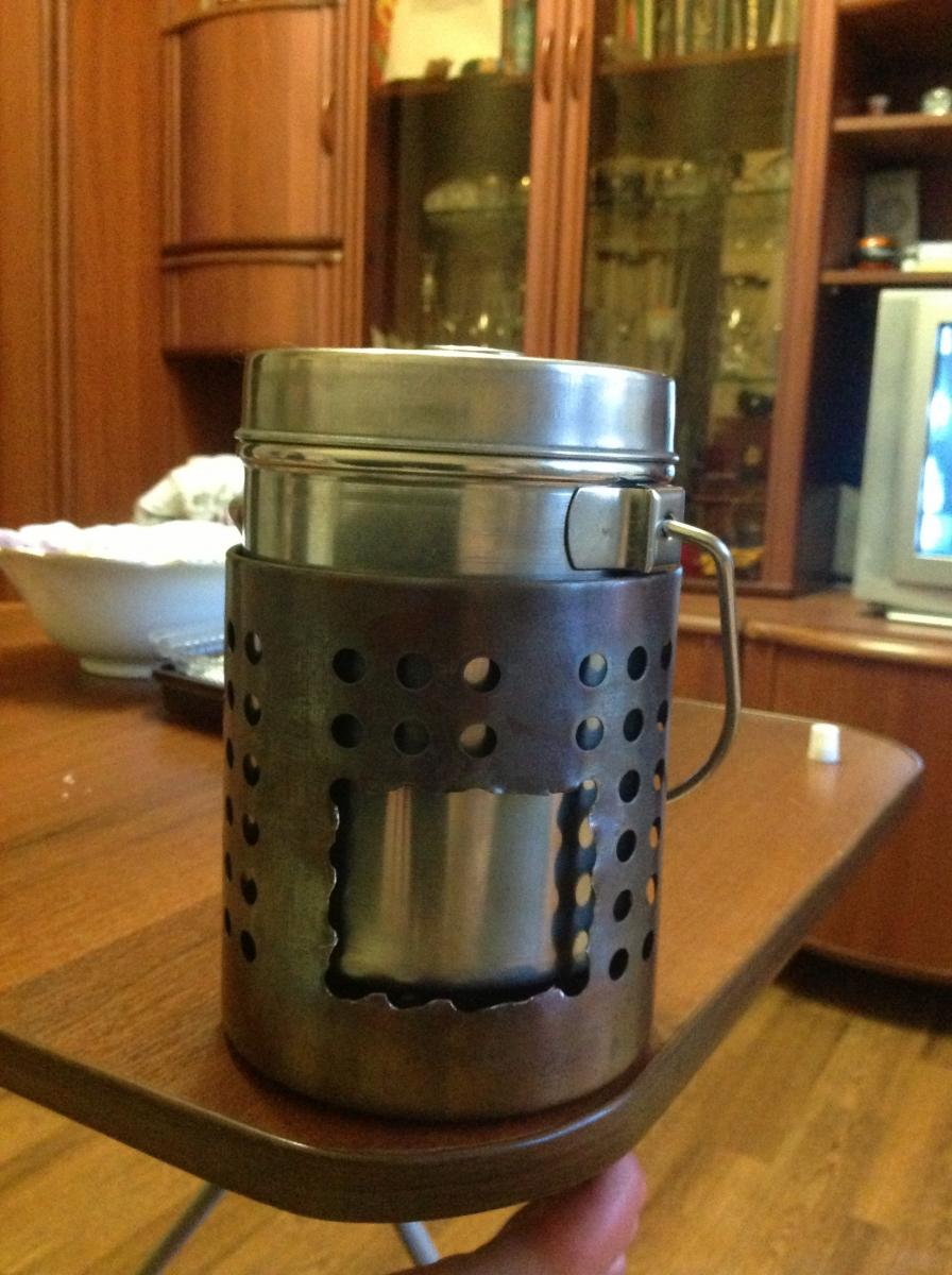 В бытность молодым охотником таскал 1,2л термос "Гейзер" - вроде из Челябы он. Лепёха пресная (не замерзает при любом морозе), шмат сала на 300-400г, сахарку-конфеток. Чай в термоске - просто замечательно. Перекус-перегрызон со сладким чаем да с салом с лепёхой энергии придаёт ощутимо, но ... Но в какой то момент стал интуитивно замечать лишние габариты сего термоса. Болтанку в сидоре - хоть как ты его неложь-неторочь. Хоть с чаем был бы он, хоть пустым. Стала появляться какая то неуютность и от пустого, но относительно тяжеловатого термоса и ... И плюнув на все удобства термоса завёл котелок. Солдатский с крышкой-сковородочкой. Алюминиевый. На 1,5л. Наверное с 1996г. Пользуюсь им и сейчас. Бывает таскаю и самодел из высокой консервной банки, типа из-под ломтиков ананаса. Объёма? А х.з. Наверное 1л с небольшим.