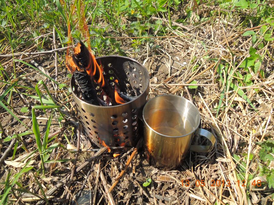 Конечно же топорик таскаю с собой невсегда. И поскольку тонкий сучок (1-2см в Д) разгорается и горит быстрей, то достаточно путного ножа. Ложка у меня деревянная и не студит и не палит и в воде не тонет