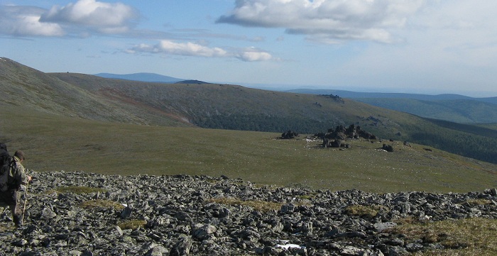 Он на перевале между горами Хозья-Таляхчахль и Сомъяхнелчахль, там целая серия каменных останцев вот фото, слева восточный склон Хозьи, высокая вершина на горизонте Отортен, на его фоне справа тёмная вершина Холотчахль. Мы прошли по левому краю "города", а брошенные вещи были справа.