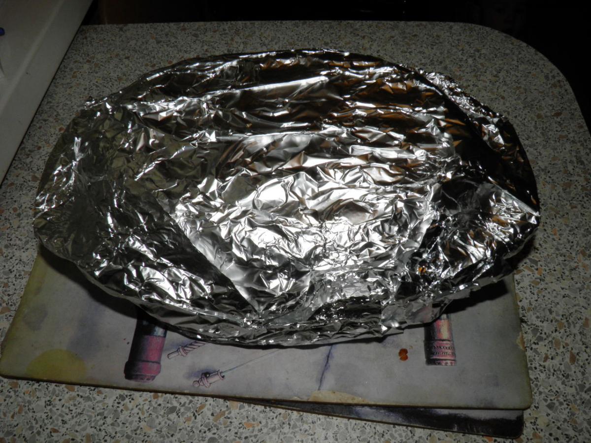 Зашиваем, натираем растительным маслом, закладываем в утятницу, на дне которой лежит решётка, её сделали из фольги
