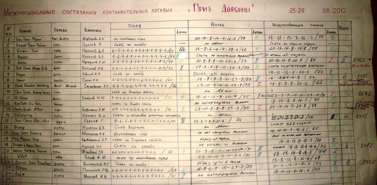 Первое место на Состязаниях с присуждением званий Полевого Чемпиона по комплексу, Полевого Чемпиона по утке, с вручением «Приза Доранны» занял немецкий курцхаар Sante-Cristo Albus (Д-III при 71 балле по болотной дичи, Д-I при 88 баллах по утке и Д-I при 90 баллах по волоку, всего 289 баллов) владелец Борисенко А.Ю., которому также вручен Егерский приз.