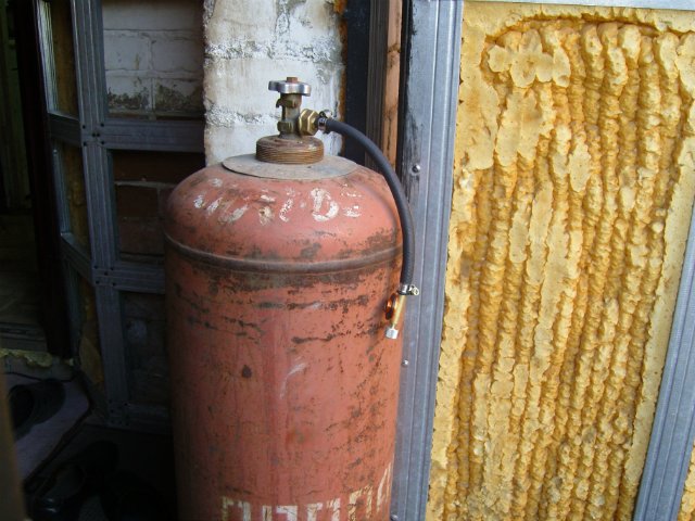 Кладем большой газовый баллон на какую нибудь возвышенность (в моем случае это был порог), под башмак баллона (нижнюю часть) подкладываем какой нибудь предмет (у меня это кирпич), так что бы вентиль баллона оказался как можно ниже.