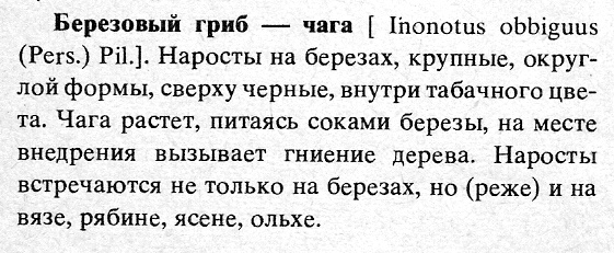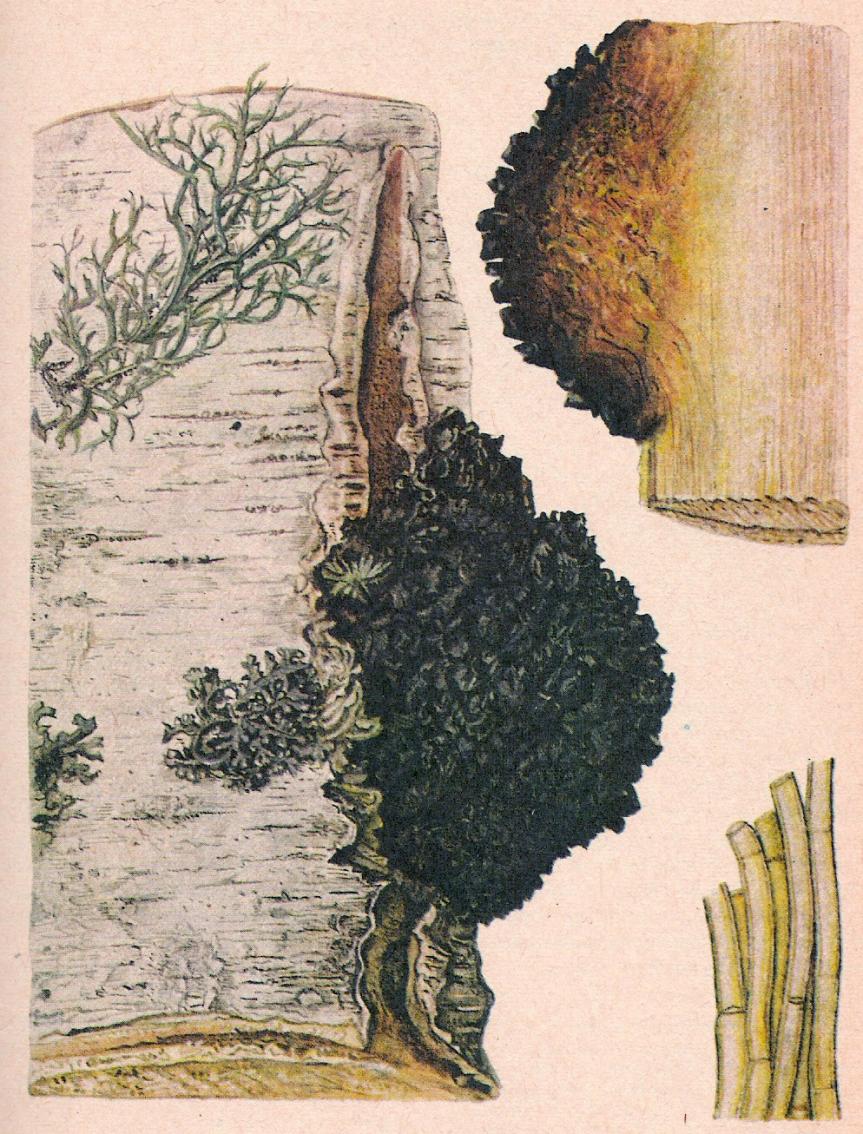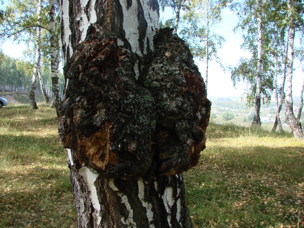 Википедия, конечно не Большая советская энциклопедия, но все же))Поверхность нароста чёрная, покрыта многочисленными трещинками. Изнутри окраска тёмно-коричневая (вследствие пигментации гиф), ближе к древесине переходит в рыже-бурую. Нарост пронизан белыми прожилками, состоящими из бесцветных гиф. Рост порой может продолжаться до 10—20 лет, но неминуемо ведёт к гибели дерева-хозяина.