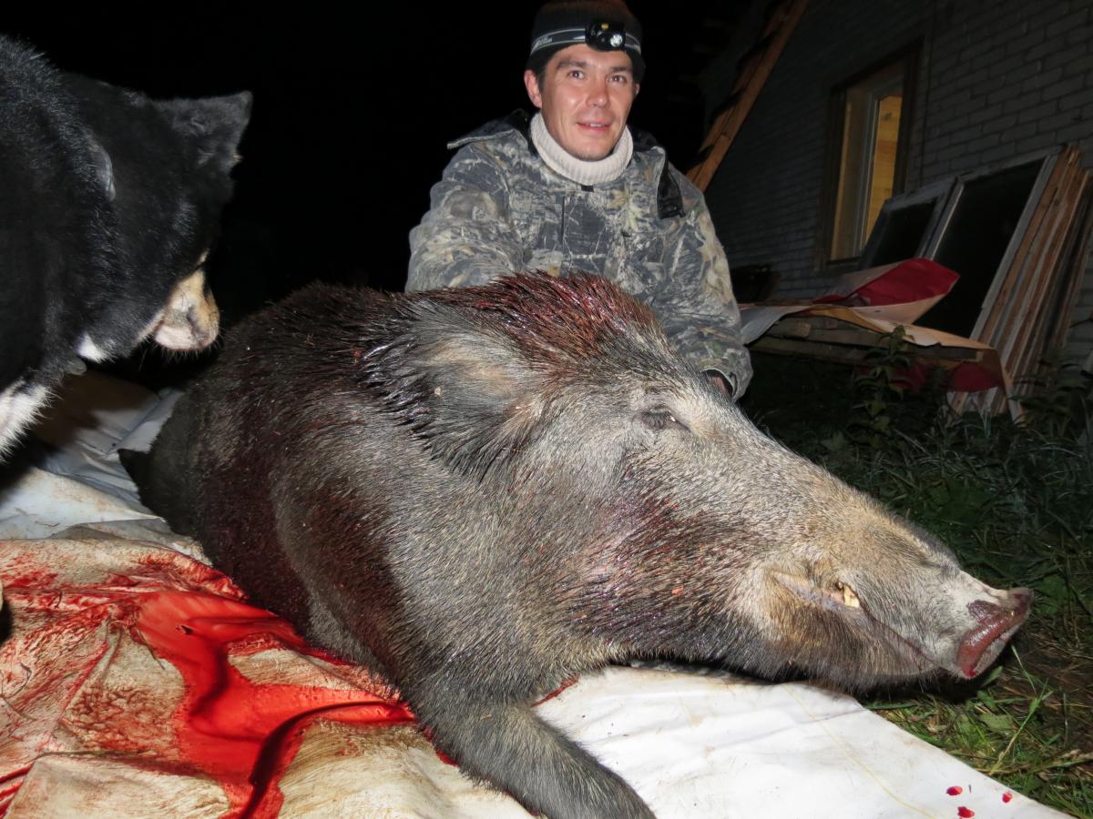 Нажав на кнопку фонаря я на миг успел испугаться того, что сейчас стадо рванет во все стороны:cg:. Но этого не произошло:dance:. В прицеле я увидел замершее удивленное рыло. Отраженный свет от глаз не выявлял сильного беспокойства. Но я тянуть не стал. Прицельную марку быстро навел на подреберье (туша стояла ко мне в полуугон рылом от меня) так, чтобы пуля прошила всю грудину по диагонали. Плавно нажал на спуск. После выстрела парасик хрюкнул и ломанулся в кусты. Через секунду с громким негодующим хрюканьем разбежалось по кустам все стадо. На 10 минут нависла тишина. Я посветил место куда стрелял и естественно ничего не увидел. Ком самых поганых чувств подкатил к горлу. Хотелось крикнуть и надавать себе оплеух. В смятении позвонил товарищам по коллективу и сообщил, что я стрелял по кабану и он ушел. Как и ожидал - настроение приехавших ребят было крайне скептическим.