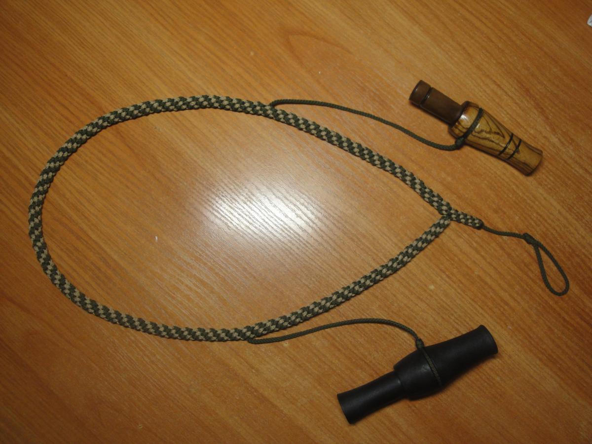 Задумался и я связать себе подвес для манков на утинно-гусинную охоту.Вспомнил пионерское детство,как мы в пионер лагере разматывали катушки ниток,свивали их и плели браслетики.Заехал в магазин для шитья и нашел там хороший шнурок разных(лесных) тонов.С паракордом решил не заморачиваться,крепости и у этого шнура предостаточно.Пыхтел часа два и вот что получилось.