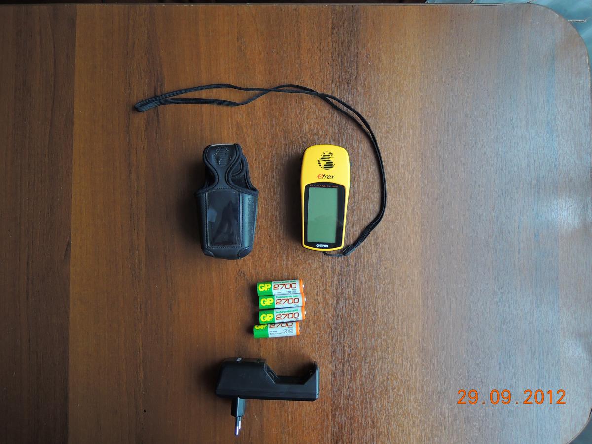 В комплекте навигатор,четыре аккумулятора емкостью 2600 мА,зарядное к аккумуляторам,родной неопреновый чехол Garmin,шнурок на шею