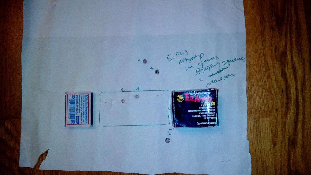Стрелялось с 7 патронного полного магазина по одному выстрелу в серии. Стрельнул. Подошел к мишени, дозарядил и опять стрельнул. Так пять раз. Лежа с мешка.