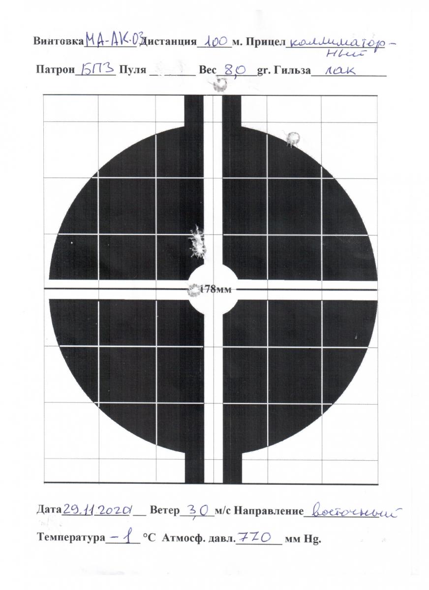 Я стрелял из АК со стволом 28 см, используя коллиматорный прицел. То есть марка закрывала всё чёрное "яблоко".