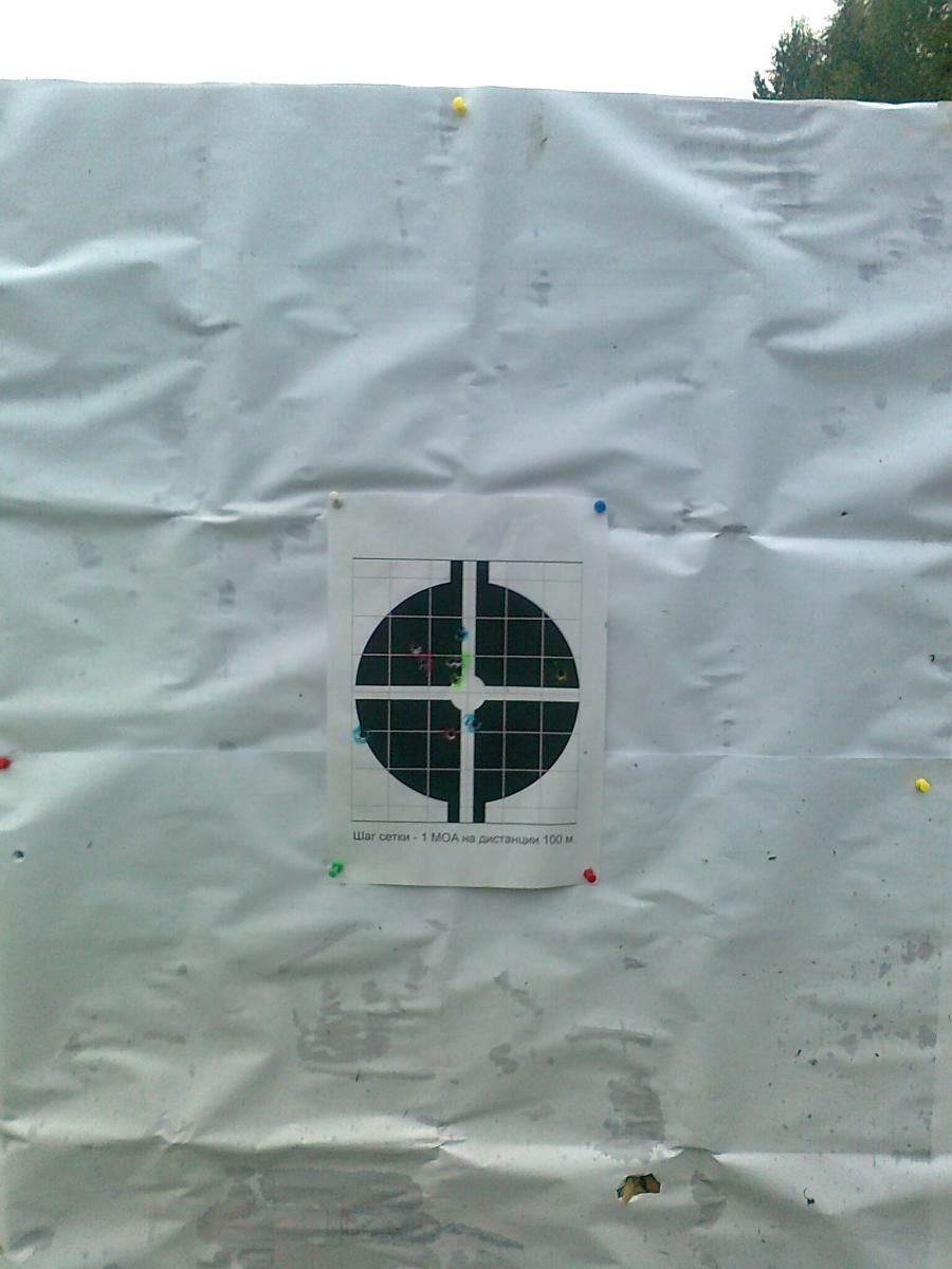на даче замерил 100 метров, насадил на прутик коробок. Стрелять не стал, мушка у комбинашки шириной 2 мм. На такой дистанции на мушку можно посадить с 10-ток коробков. Наверное можно попасть , но очень случайно. Сорри фото вверх ногами, планшетник дурит, коробок в центре фото под деревцем.