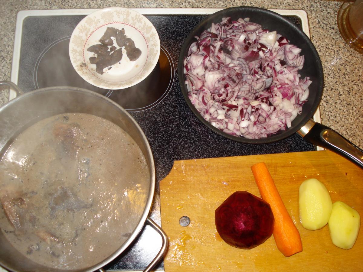 Пока жарится чистим 5 головок лука, 1 небольшую свеклу, две моркови. Лук режем мелко. После обжарки кладем утку в четыре литра теплой воды и варим после закипания 1,5 часа. Снимаем пену.