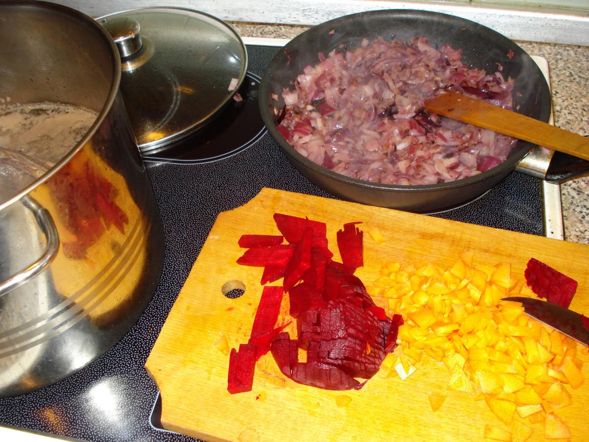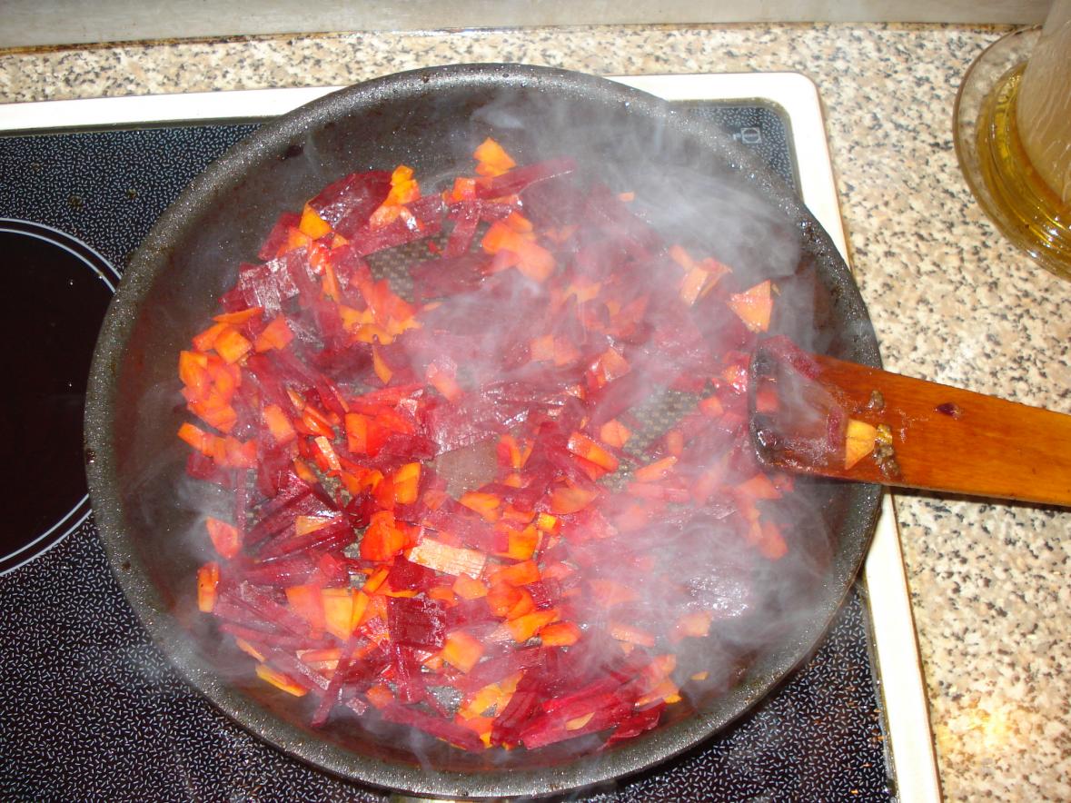 Жареный лук выкладываем на тарелку. В сковороду добавляем еще две столовые ложки растительного рафинированного масла и обжариваем морковь, затем половину моркови убираем и кладем свеклу.