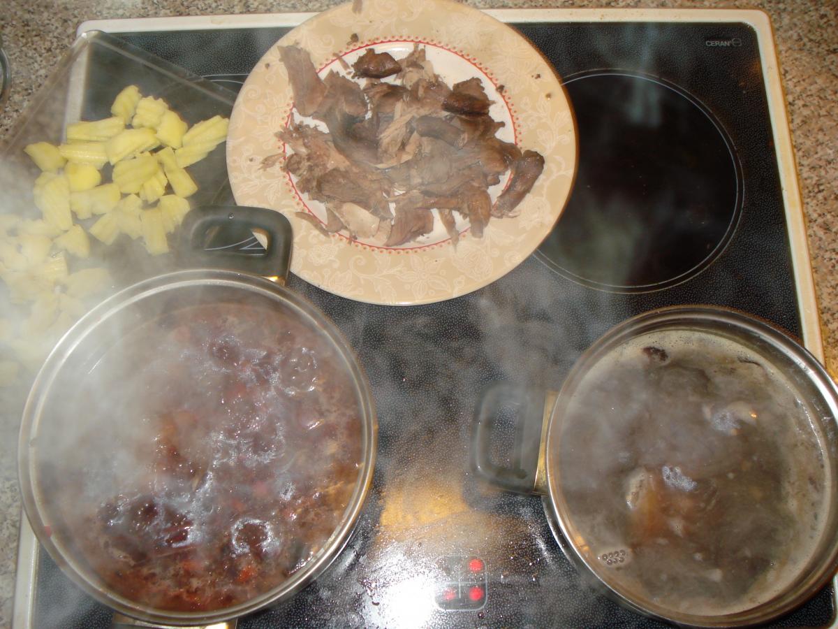 Вынимаем из бульона утку, очищаем от костей, разливаем бульон в две кастрюли и кладем в кастрюли мясо. Ножки от костей я не очищал, положил так.