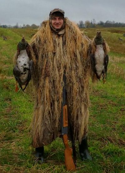 выходит на высоте 5-10м. ЗАворачивает на нас. 50м, 30м, 15 - даю команду. Бах-... Виталя (товарищ) в первые сбил дуплетом 2 белолобых