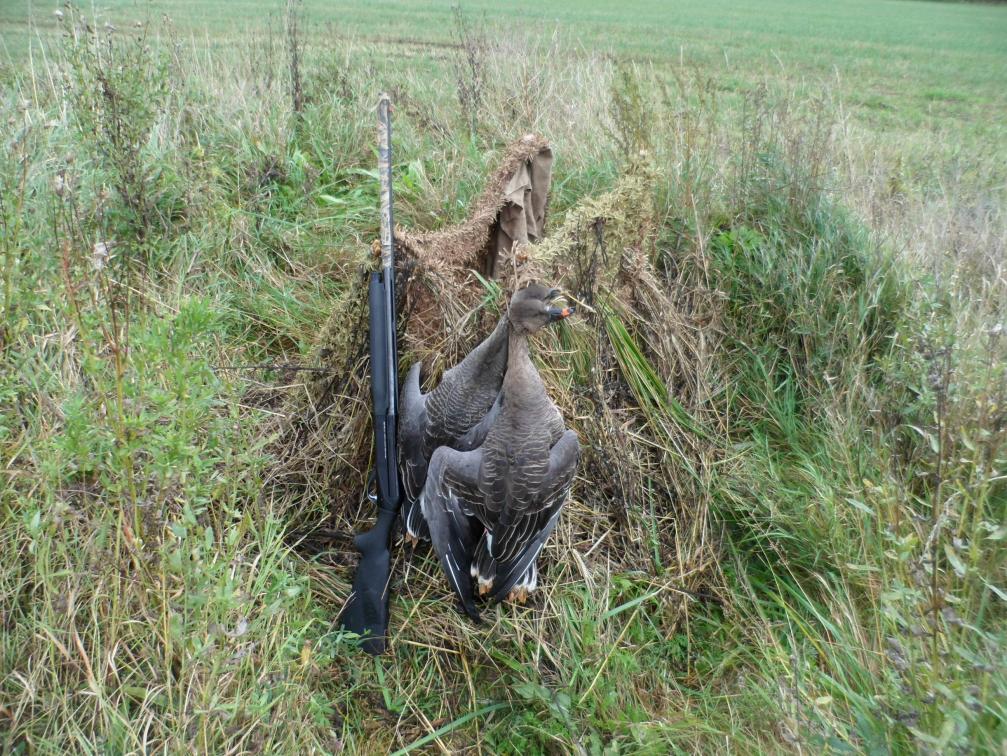В спешке перебираюсь на соседнее поле. Перетаскиваю профиля, раставляюсь, маскируюсь и в этот момент за спиной раздается одиночное, короткое гужение. Плавно приседаю и вижу как на меня заходит тройка. Я был озадачен, так как не срисовать меня было невозможно, а потом понял в чем дело))) Я не взял ружье и они это тоже знали)) Гуси совершенно спокойно зашли прямо через меня так, что я не только лапы,а каждое перо наверное мог бы отдельно рассмотреть(5м это максимум). Смеркалось и я ободренный пошел в лагерь.