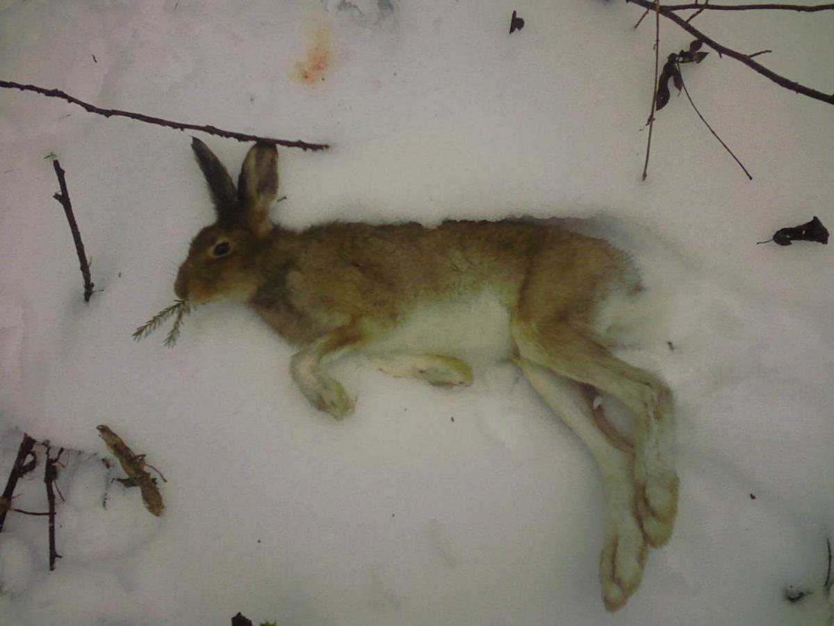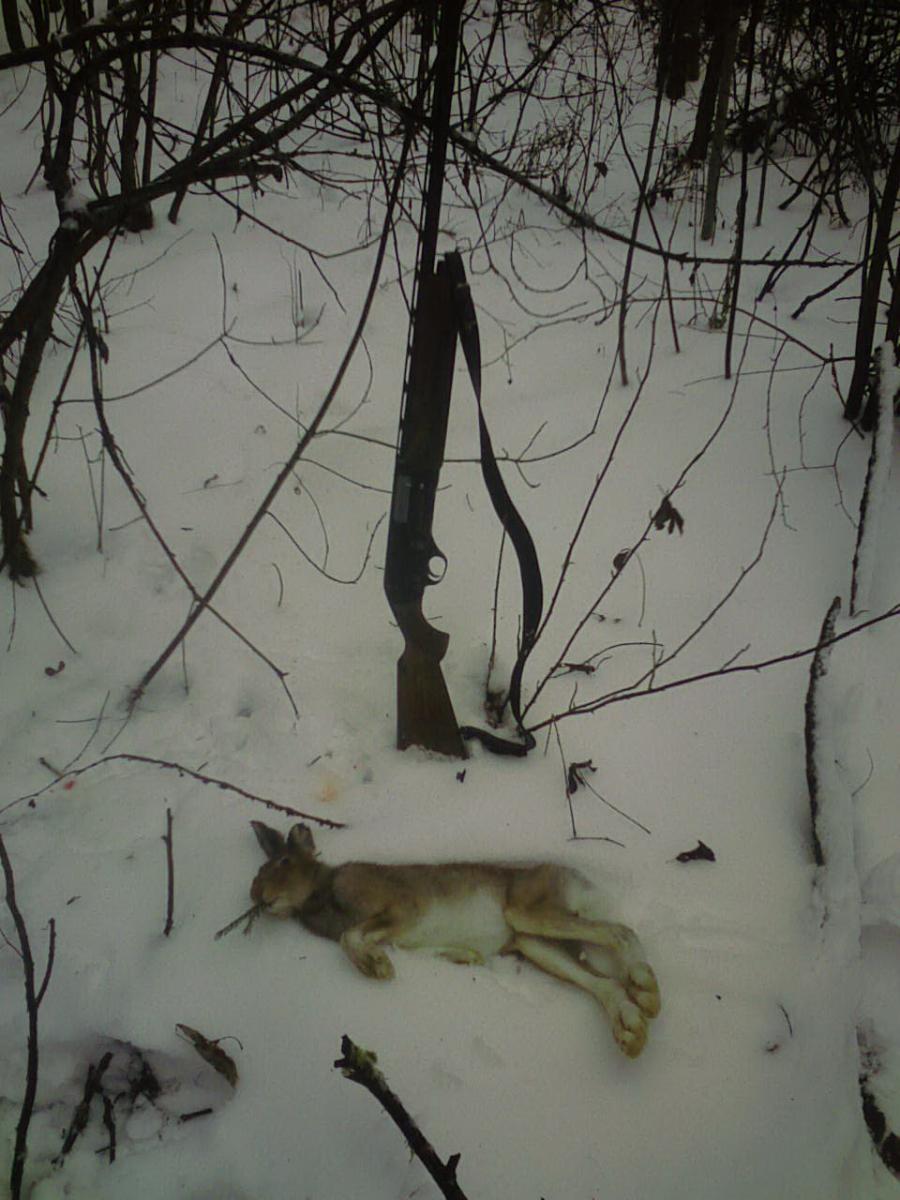 Снег выпал еще в субботу, но маловато для тропления, поэтому я не торопился. А вчера решил взять путевку на зайку. Озвучу цены: на зайку, для членов общества 600, для всех 1200. Если хочешь рябчика, то это отдельно еще столько же. Вобщем мне немного обидно,... раньше 10р и можно все от утки до глухаря, зайца и лисы, на весь сезон охоты. Теперь же как в магазине,... выбирай, чего изволите, и платите за все отдельно. Ну да ладно, это предисловие. Вечером ложился спать снега не было, поэтому решил определиться по обстановке... Утром встал и глаз порадовался, за ночь снега выпало около 7см. Решил надо ехать, хотя и знал, что след найти будет трудно, т.к. заяц в снегопад ходит мало, но зато если нашел след, то он тут рядом и лежит. Вобщем я легко оделся, кинул 10патронов в кармал и отправился в угодья. Мне видимо везло сегодня и долго лес прочесывать не пришлось. Через 20минут я нашел старый(вчерашний) след зайца, и принял решение тропить его, так как он приведет меня либо к свежему следу, либо к свежему зайцу... После ночного снегопада след был едва заметный, просто небольшие углубления в снегу, заметные только под определенным углом, но для меня этого было достаточно, у меня была цель, и я к ней двигался... След немного поплутал по лесу, а затем вышел на поле, где отслеживать его стало значительно трудней из-за переметов снега, но и с этой задачей я справился. След привел меня в небольшой островок леса, (примерно 500х150м) посередине поля. Это уже было ближе к цели. Заяц ходил по густому ельнику, пытаясь сбить меня, но яя его обходил и потихоньку двигался вперед. Прошло примерно полчаса с начала погони когда я увидел первую скидку,... И тут я обрадовался, значит заяц здесь, рядом. Буквально через 15м вторая, ... все, он точно здесь. Бросаю старый след и иду примерно в середину между скидками, так и есть, вот он сегодняшний утренний след...! Я почти в углу леска, впереди опушка в 70метрах, слева и справа в 50м. В такую погоду заяц далеко не ходит, где спал, там поел, и тут же и лег. Вобщем ружье на изготовку и неспеша по СВЕЖЕМУ следу. Я прошел буквально десять метров, и сначала услышал какойто шум, а потом и увидел мелькающего в кустах зайку. Вскидка, выстрел..., но он продолжает бежать, правда уже не так резво, но я помня о том, что в этом же месте мне пришлось 3 часа бегать за подранком, стреляю еще два раза. Все, дошел. Первый зайка в этом сезоне. Только не пойму почему почти весь серый. На мой взгляд, это все-таки неперелинявший беляк.