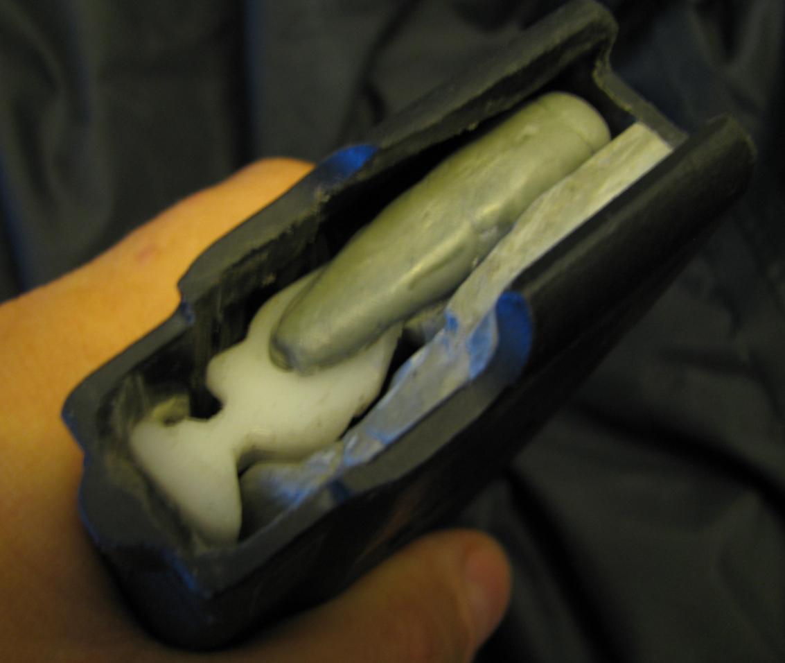 Очень муторно идет создание однорядного магазина. Сначала нормально подавал три штуки, если заряжать больше трех - утыкает. По началу бросился пилить губы магазина - не помогает. Изменил угол подавателя - начал подавать 4 патрона. Если еще сильнее увеличить угол, не знаю, может начнет пять штук подавать. Настроил на подачу с правого края.