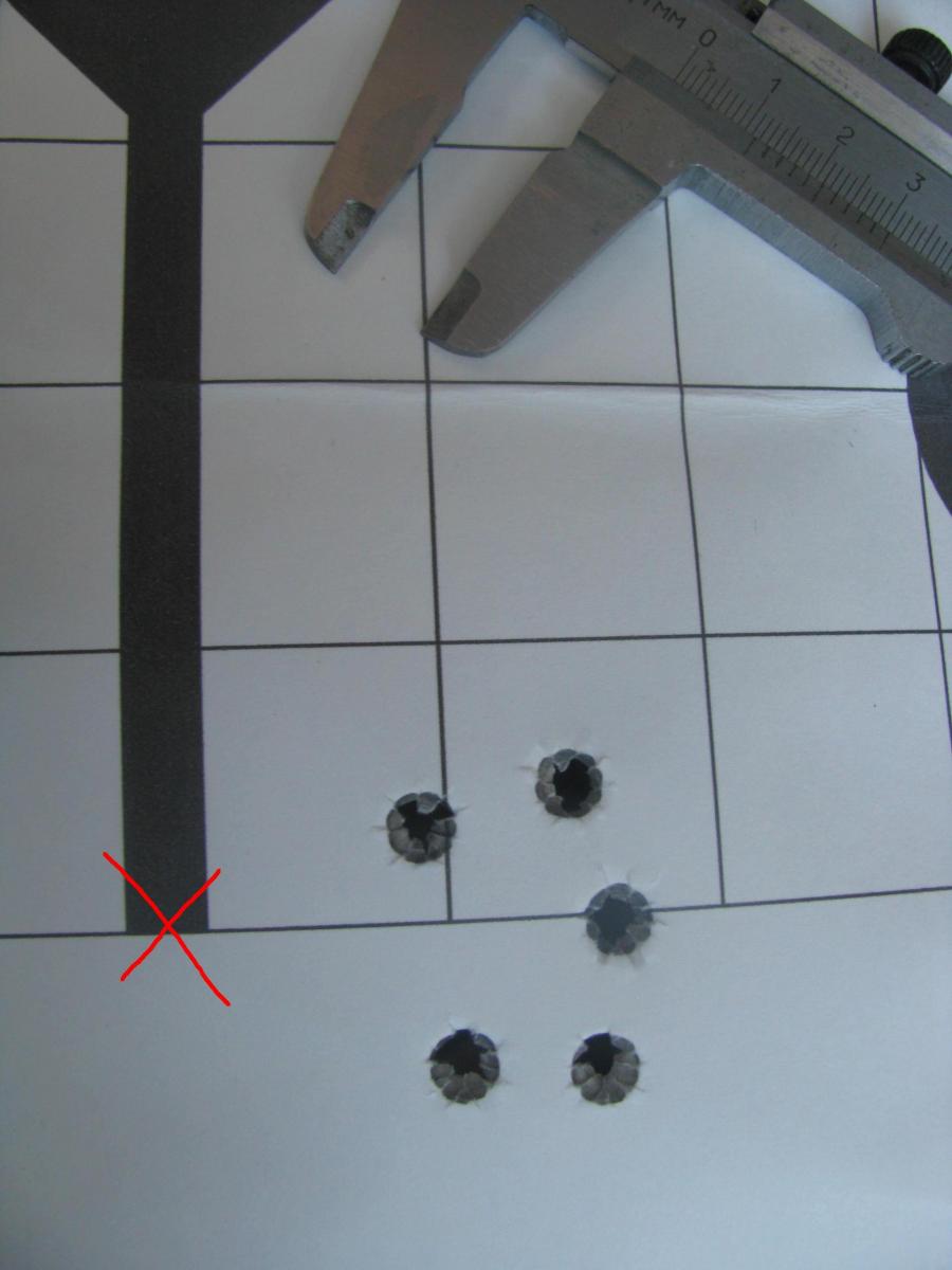 На 130 метрах, из пяти групп S405, отстрелянных с упора, только две могут быть полностью накрыты спичечным коробком, а еще одна - ну, почти. Поперечник групп получился 65мм, 49мм, 98мм, 42мм, 86мм. На фотке две лучшие группы. Напомню, габарит спичечного коробка - 51х37мм.