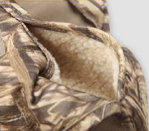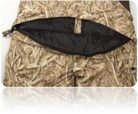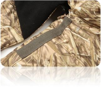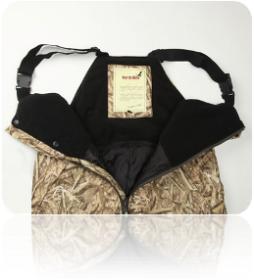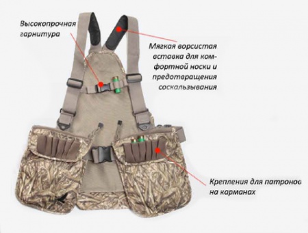 Карманы руковицы утеплены искусственной бараньей шерстью. Карман рюкзак для дичи расположен на спине, имеет отверстие для вывода влаги. Подгонка лямок под любой размер.