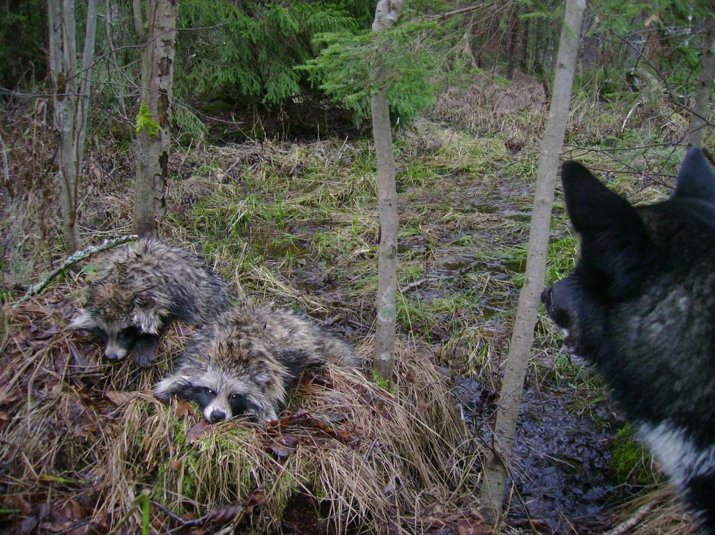 Прогулялись по угодьям. Лоси сегодня какие то реактивные. Из пяти встреч под собаками постоял только один и то не долго.Подойти на расстояние удобное для съёмки не получилось. А вот еноты(енотовидные собаки) сегодня активные. Повылезали покормиться. Лаечки словили пару. Досталось им малость от молодой.Но не покалечила. Отпустил я их потом.