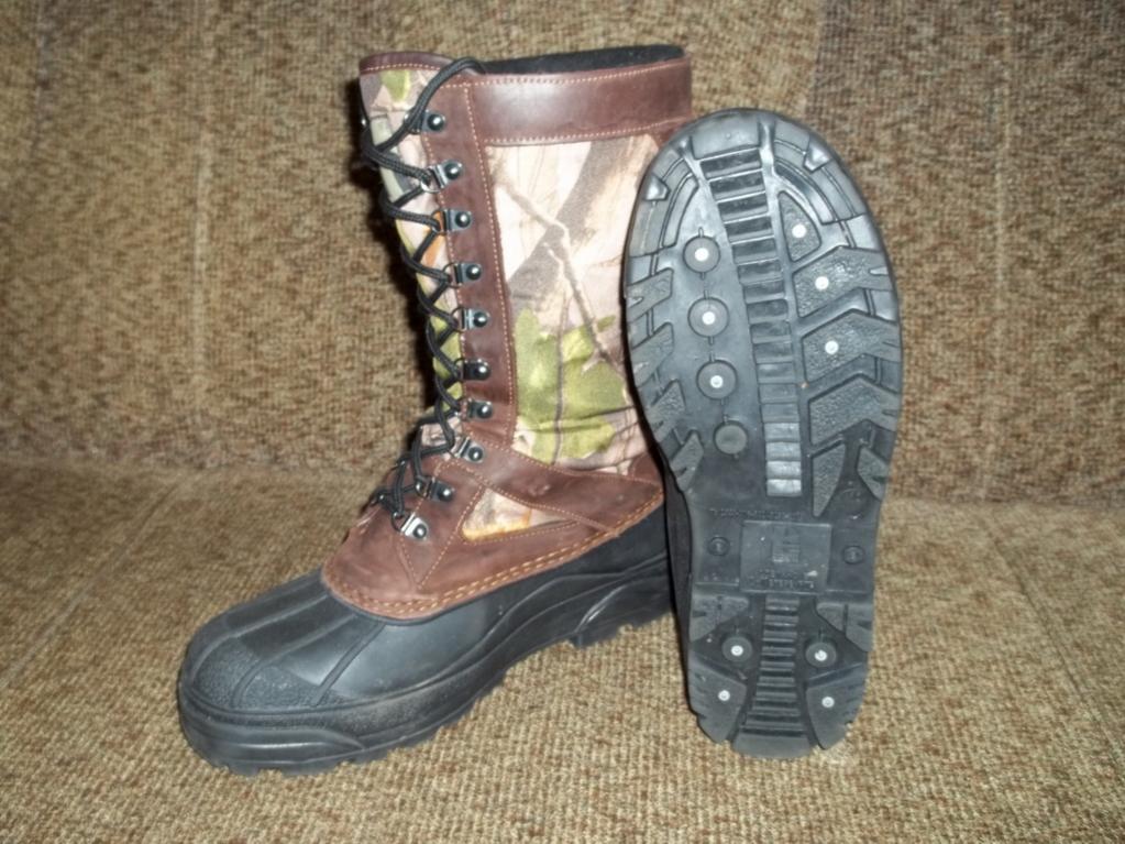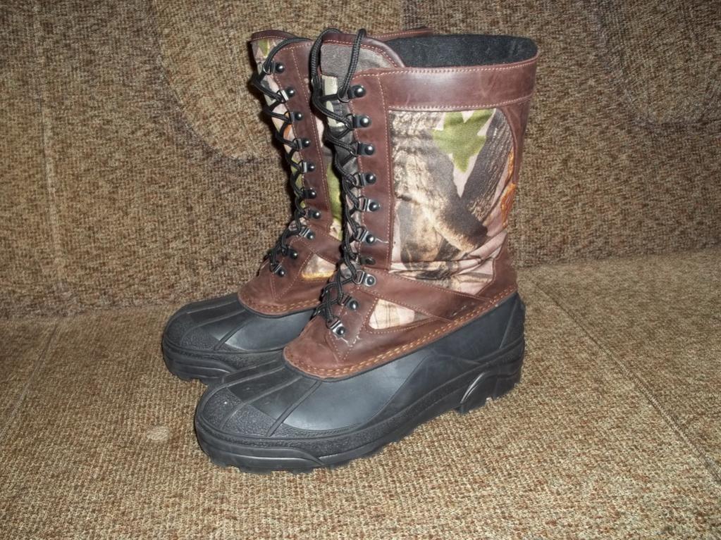 Отличные сапоги для зимней охоты. Обувались ровно один раз зимой на охоту. Нареканий нет, кроме размера. Мои ноги 43 размера, а эти сапоги 45. Великоваты, отсюда желание продать. Сапоги очень хорошие, теплые и удобные. За бортом было -22 -23, не было даже намека на замерзание ног. Подошвы шипованые, все шипы на месте. На вид - новые. Внутри трехслойные термоноски, легко вынимаются для сушки. Цвет - камуфляж "Осенний лес". Температурный режим -25. К слову, я себе на зимнюю охоту купил точно такие же на два размера меньше. Доволен как слон.