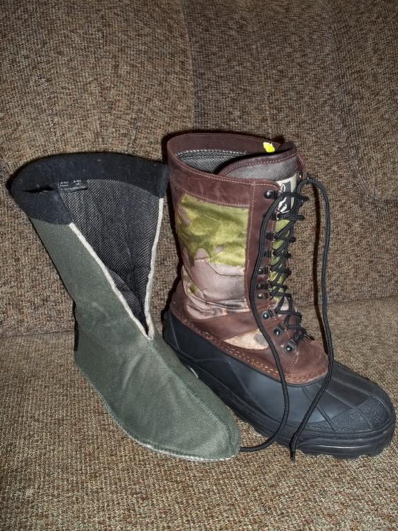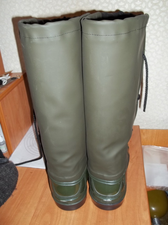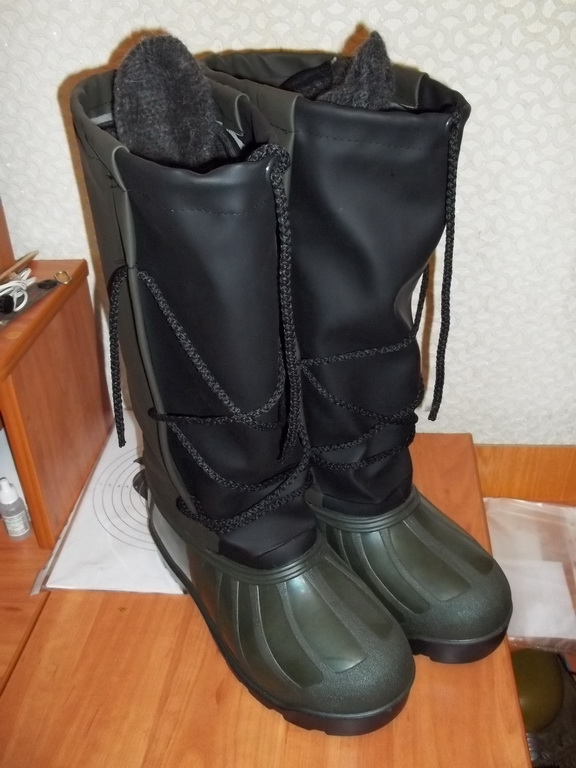 Но обижать человека не стал и вот теперь надо их куда-то пристроить. Классические рыбацкие бахилы, внутри бурка. Высокое голенище, подошвы шипованые. На вид серьезная обувь, ногам должно быть тепло при длительном сидении на одном месте. При покупке в подарок утепленный синтетический носок, разумеется новый