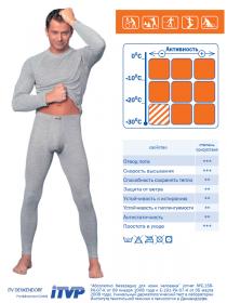 В комплект входят футболка и кальсоны - для мужчин; футболка и леггинсы для женщин. Спинка у футболки длиннее полочки, что гарантирует сохранение спины в тепле.