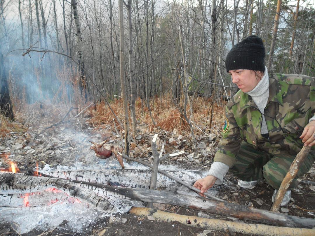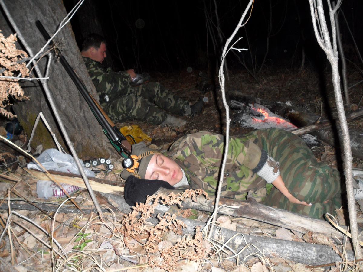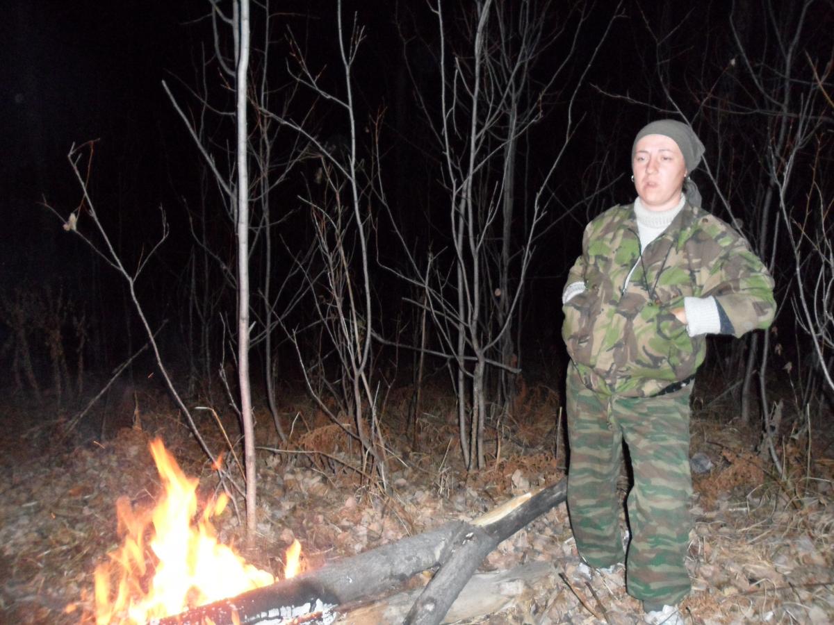 Через пару часов двинулись отрядом из четырех человек. Пока добрались до последней лежки уже стемнело. Пришлось организовывать ночевку в виде большого костра (всё таки середина октября), а пошли налегке. Договорились, что вторая группа присоединится к поискам утром, и с провизией для нас. Первую половину ночи я боролась то с жарой, то с холодом, зато вторая половина прошла в борьбе за удобное положение, так как ночевка была под уклоном, и я постоянно во сне скатывалась ккостру.