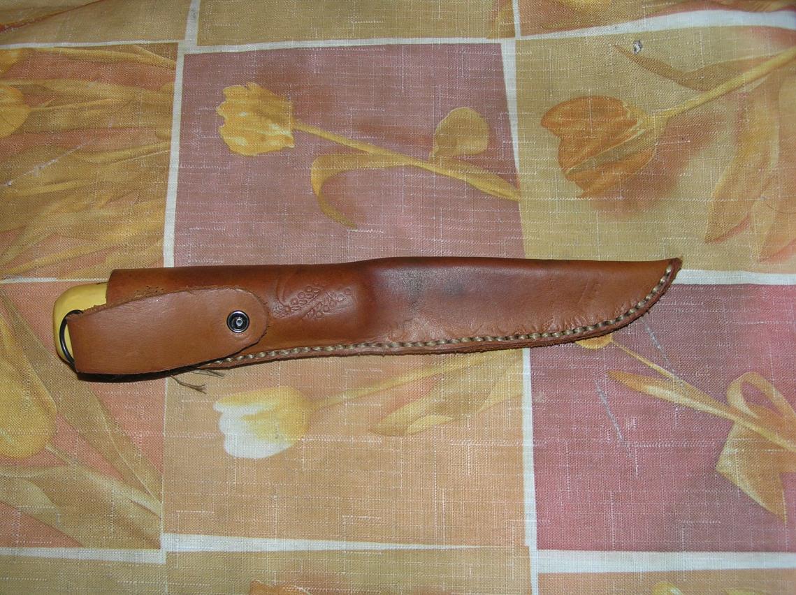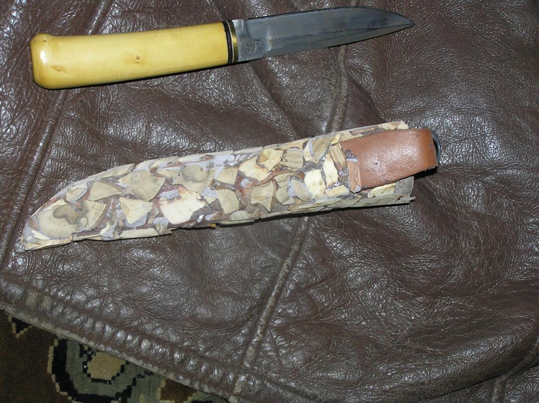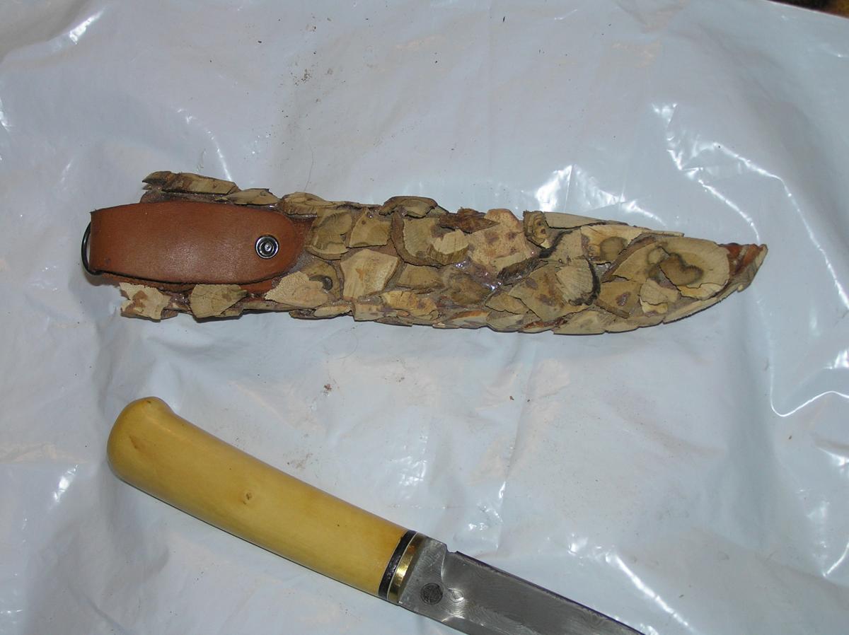 В результате внутри достаточно толстый слой кожи ( внутри пропиталперед сшиванием). Кожа отформована по ножу и думаю, благодаря внешнему панцирюформу не потеряет. Снаружи бронь и достаточно симпатично, благодаря тонкому слою дерева ножны практически не утяжелились.