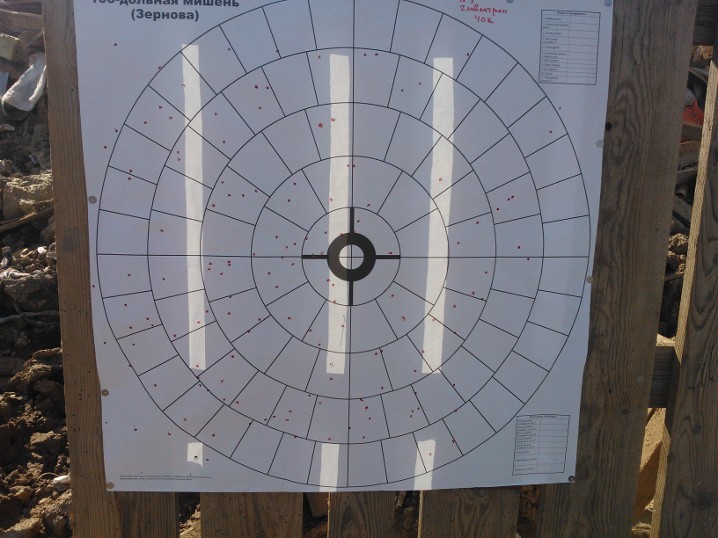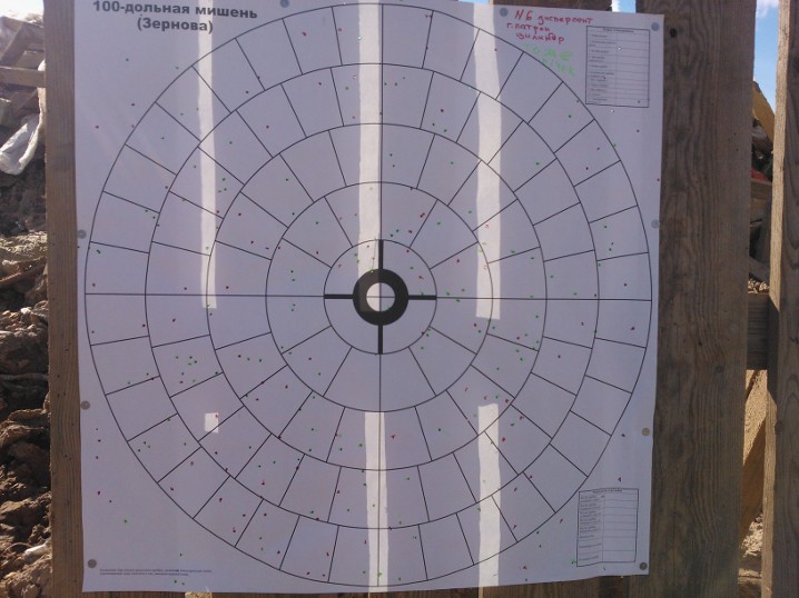 Далее пробный отстрел по мишени Зернова на дистанции 35 метров патронами №6 дисперсант и №5 в контейнере Главпатрона, №6 в контейнере СКМ. Отстрел показал низкую равномерность осыпи у насадки цилиндр - три соприкасающиеся между собой доли во втором - третьем круге не были поражены дробью №6 (крякву или обнесло или будет подранок) с другими насадками в основном не более двух.