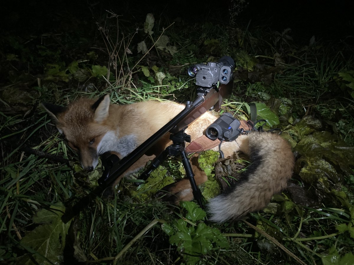 Увидел с дороги на противоположном краю поля у леса мышкующую лису. Писком приманил метров на 75-80. Долго высматривал ее в ночник посреди скошенной кукрузы, пока голова была опущена. Пискнул. Лиса подняла голову. Глаза засветились. Бац! Готова.