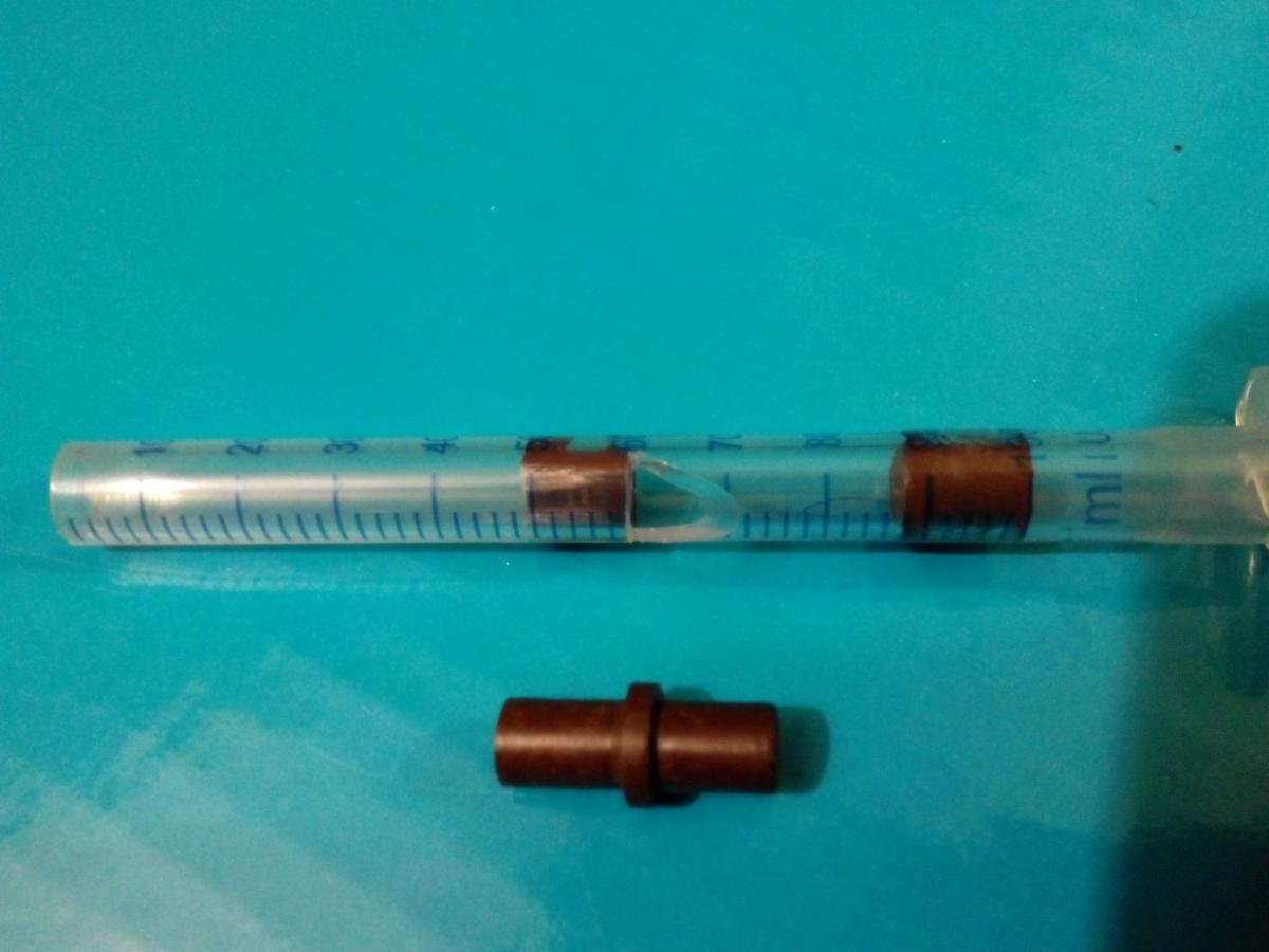 Сделал манок. Вставку подобрал от такого пластмассового мебельного шпинька, на которм полочки держаться. Заходит очень плотно, в месте где держиться, даже не большая выпуклость. Поршнем настроил, а по шкале заметил место... Вторую часть шпинька засунул до этого деления, поршень не мешается. IMG_20150212_154432688.jpg