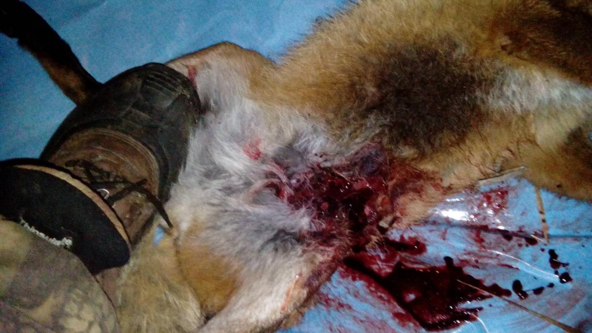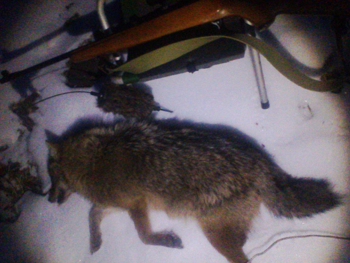 Вместо лисы на манок вышел сегодня вот такой зверь. Там, в принципе, их не меньше, чем лисиц. Вышел как-то незаметно, с неожиданного направления, ветер был от него, а заметил случайно в бинокль уже метрах в сорока. Немного охренел: карабин на коленях, зверь поглядывает на "механического зайца" и обходит его полукругом, нас разделяет вышеупомянутое расстояние и редкий сухой бурьян. Когда он пошел, я начал медленно поднимать винтовку, потом пикнул губами, и зверь замер на мгновение. Накинул перекрестье ему на грудь и выстрелил, а зверь, вместо падения на месте понесся от меня во весь дух. Второй раз стрелял уже по уходящему метров за сто, после выстрела потерял из виду (там сухая трава и небольшие складки местности). Еще посидел, один раз поманил, а уже в сумерках решил пройти по направлению уходя зверя и там его нашел. Первая пуля (которая с 40 метров) попала в коленный сустав на задней ноге (до сих пор не пойму, как мог промазать, видимо, мандраж от неожиданной встречи), а вторая вошла рядом с хвостом в крестец и уже не вышла. Когда снял шкуру, надрезал грудину между ребрами, вся грудная полость заполнена кровью. Видимо где-то в груди пулька и остановилась (оболочка 5,6х39). кстати, после первого выстрела в лесу метрах в ста раздался короткий полувой-полулай, зверь, судя по всему, приходил не один. но после стрельбы, несмотря на последующую тишину и через минут 10 крик "зайца" дураков уже не было. Быстро стемнело, снег редкими пятнами, пасмурно, поэтому сидеть дальше смысла не было.