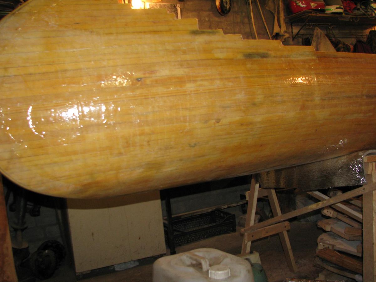итак друзья, кому еще интересно , приступим к описанию проведенных работ. перво наперво надо найти проект который вас устраивает, по каноэ в сети можно найти пару тройку бесплатных проектов, а кто дружит с анг. то можно и купить у пиндосов не так дорого. дальше переносим чертеж на картон или бумагу которую клеим на двп и по этому шаблону выпиливаем из дсп либо фанеры прфиля шпангоутов, за тем собираем так называемый стапель. ну вот стапель собран, следующий шаг правильные рейки, для этого едем на пилораму и отбираем либо договариваемся с мастером , короче нам нужны сосновые доски без сучков!!! сухие доски распускаем на рейки толщиной 7мм. которые затем прогоняем через фрезерный станок и получаем так называемую шведскую рейку. начинаем с клейки форштевней, это такая штука , грубо сказатьребро носа,во как я обьяснил сам в шоке,для этого опять же распускаем доску на рейки толщиной 3мм. набираем из них пакет штук так в 7 смазываем клеем и загибаем этот самый пакет по шаблону носа(форштевня) и зажимаем струбцинами даем высохнуть , после того ак высохло обрабатывыем края под углом чтобы затем шведская рейка приходила по обводам и плотно прилегала. затем начинаем обшивать этой рейкой стапель, причем начинаем это делать снизу и по 3 -6 реек с одной стороны затем переход на другую сторону,это для тог чтобы скорлупу будущего судна не перекосило. каждую рейку смазываем клеем я делал это медецинским шприцом 25 кубиов в идиале надо50кубовый т.к. на одну рейку как раз стоко и идет клея , но я такого не нашел, шприцом удобно выдавливать клей в желобок рейки, и приколачиваем рейку тоненькими гвоздиками ,гвозди бьем не до конца чтоб потом их вытащить,к каждому профилю шпангоута, ну а форштевню предварительно смазаному клеем прибиваем степлером.таким образом набирается так называемая скорлупа. фотки данного процесса постораюсь щас закинуть! ну а дальше идет процесс оклейки скорлупы стеклотканью, об этом поговорим попозже, а то гляжу чтото товарищи Чингачкуки молчат! стапель