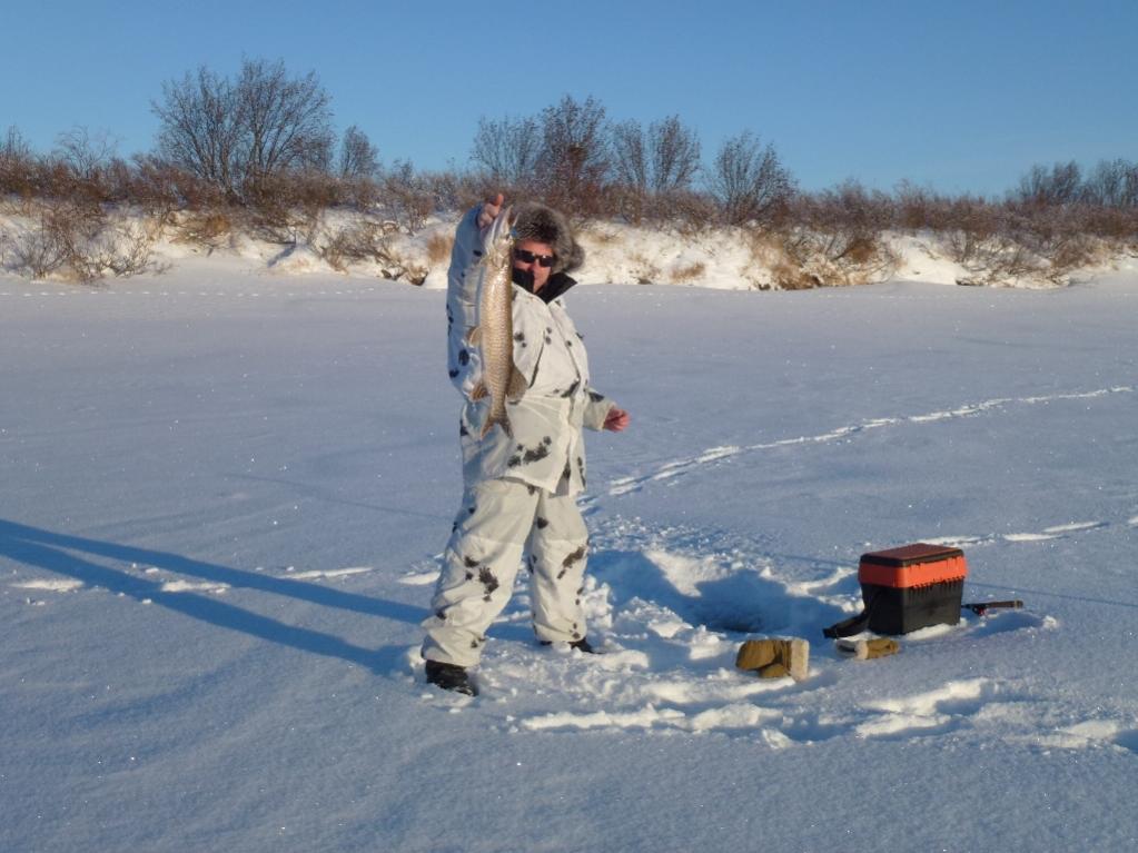 Но этот миф мы быстро развенчали и вот уже у Жени – одного из моих товарищей, звякнул фрикцион, и запела, как струна леска. Вскоре на льду кувыркалась пятнистая красавица. Весы показывали - 3,5 кг. Ну это только начало - весело и с надеждой загомонили мы и все уткнулись взглядом в свои лунки, периодически взмахивая удочкой. Да, как и полагается в таких случаях, первая щука после взвешивания и короткой фотосессии, была отпущена на волю. В этот день ловили все. И так же исправно работали жерлицы. Мы по очереди подбегали к горящим флагам, что бы у каждого были равные шансы побороться с Ямальским трофеем. Но самой крупной щукой пойманной нами в этот день оказалась красавица весом 4,5 кг, а трофеем всей рыбалки стал экземпляр чуть более 5 кг. Забегая вперед, скажу, что у местных аборигенов, как их там называют – националов рыба была крупнее, и ее явно было больше. Вот вам доказательство того, что рыба там есть - ловить надо уметь. Видели мы у них и на 7 и на 10 кг. Честно пойманная отвесным блеснением. Они, местные то есть, кстати сказать, не прятались от нас, а ловили прям тут же рядом, засверливая лед. Но где национал вытаскивал 5 рыбин – мы одну. Вот такая арифметика. Да и места они нам не боялись свои сдавать, чувствуя, что мы им не конкуренты в их родных местах.