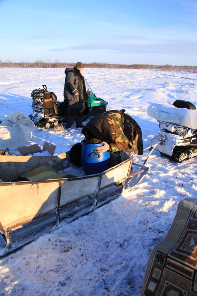 Заранее, еще до нашего приезда, Сергеем заботливо было заготовлено все необходимое для нашего проживания: перед чумом лежали дрова, укрытые от снега ковриком, стояли канистры с бензином для снегоходов, мотобура и генератора. В чуме были припасены туристические коврики, спальники, посуда и прочая утварь. Наличие безо генератора позволило нам иметь свет, что несомненно очень удобно т.к. даже днем в чуме темно (при наличии одного не большого полиэтиленового окна) и напряжение для зарядки фото видео техники.