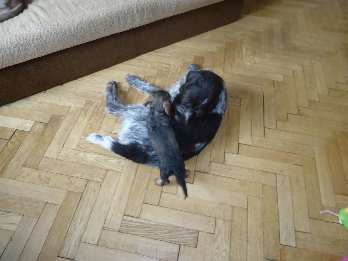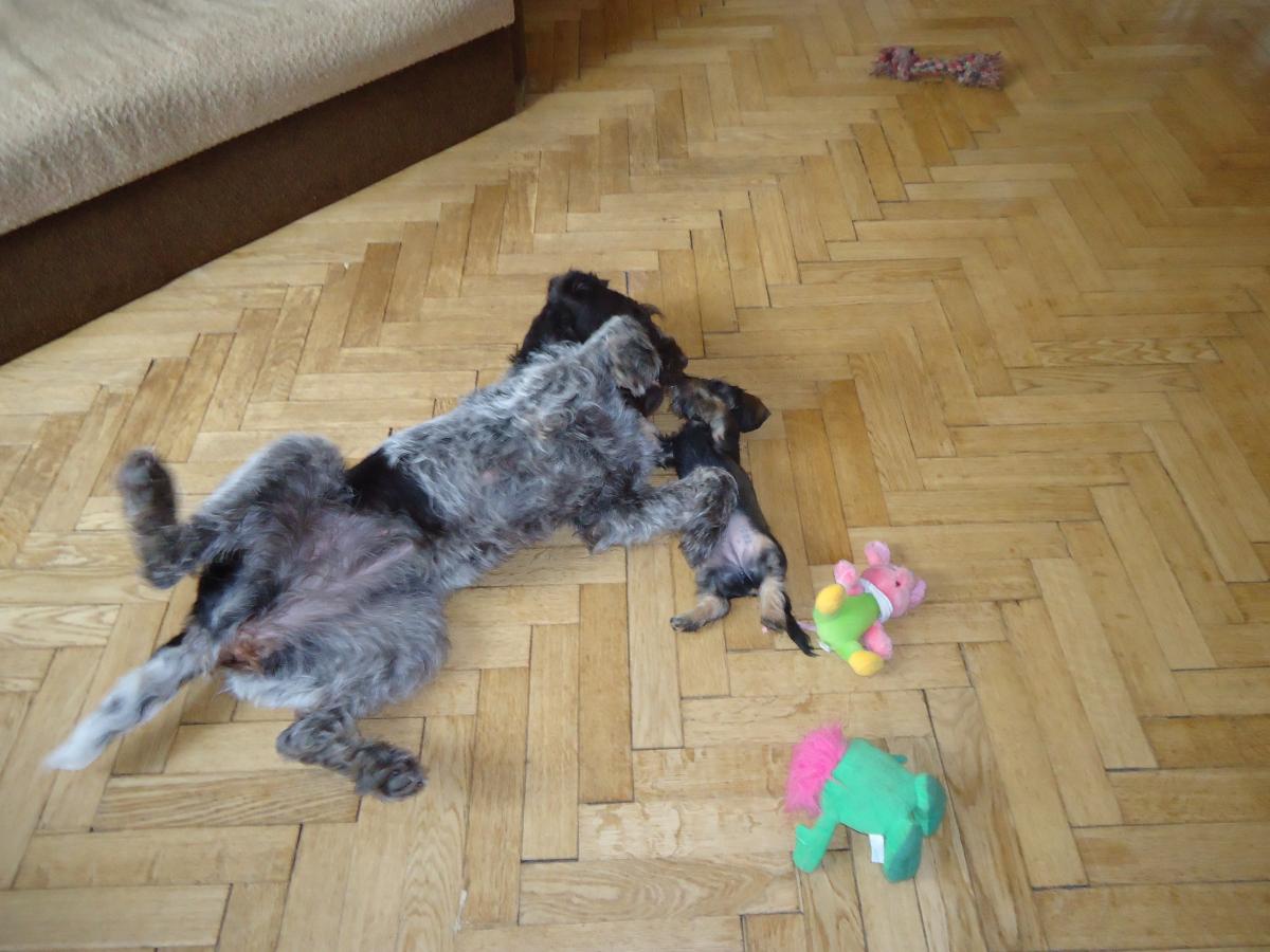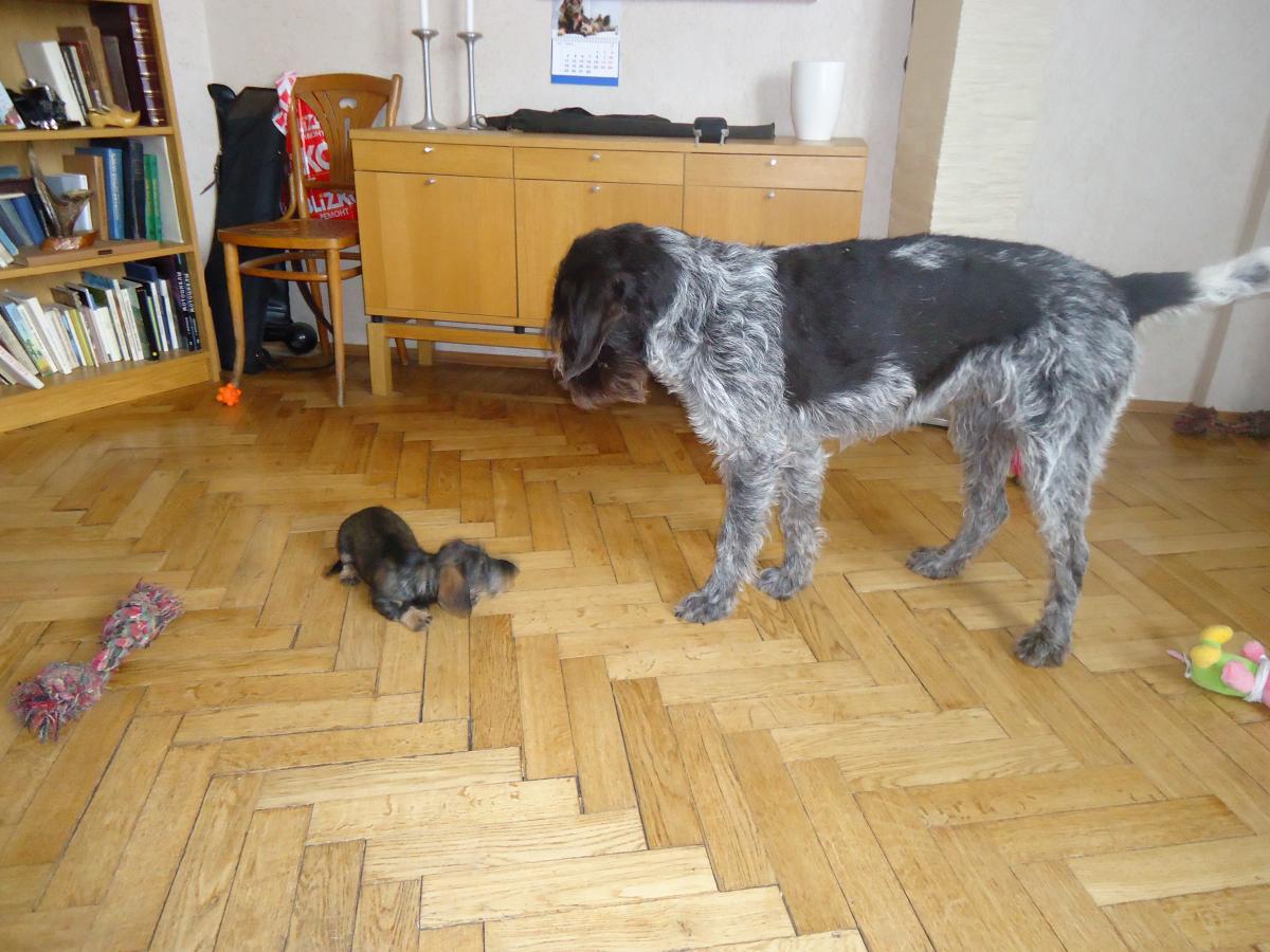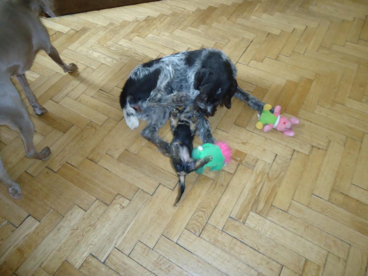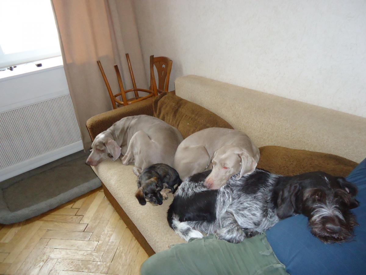 Взрослые собаки с ужасом спасаются на диванах, благо нам всего три месяца и на диван пока еще без посторонней помощи залезть мы не можем.