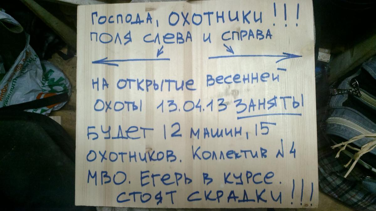 У меня были случае... Когда мои скрады ломали и свои ставили, и говорили...ничего не знаю, вот мой стоит. Я же не говорю, что поле мое, и я приеду туда в пятницу вечером. Я приезжаю на поле дней за 10, делаю скрад. Приезжаю в пятницу утром в 9.00 ... и начинаю расставляться... Я почесному занимаю место... Как мне сказали в военном обществе Леонид Олегович... "Кто первый встал, того и тапки"....и к тому же ,какой норм.охотник будет охотится на поле, на котором стоит уже 12 машин???? Хрена тут делать ,только мешать...Или я не прав...?Даааа, модно у нас стало таблички ставить....: зимой у дома - "место занято,паркуйся нах отсюда" , на машинах - "мой тел.-------ушел,сейчас приду", в полях .......ну можно пост выше прочитать...!!!
