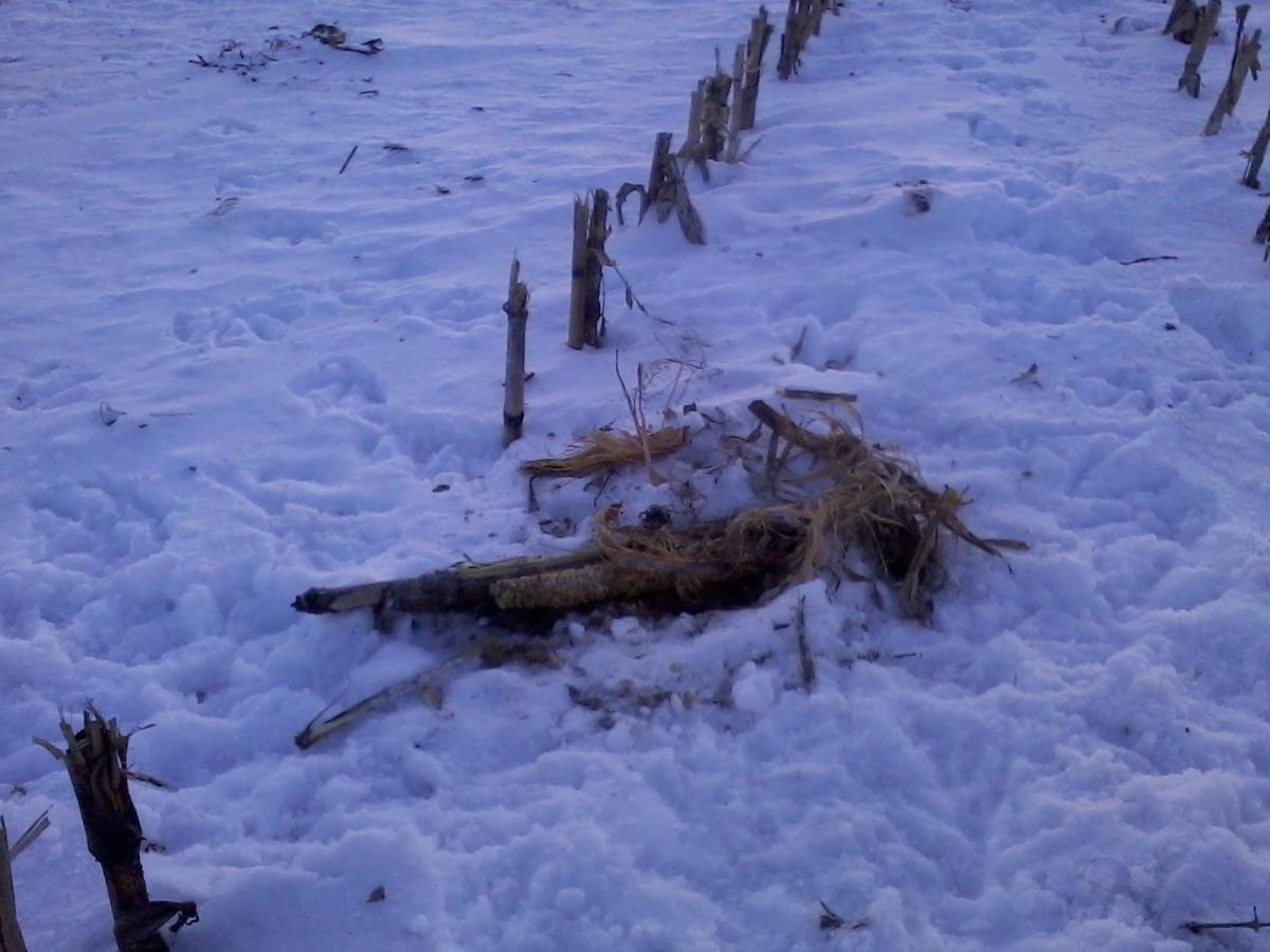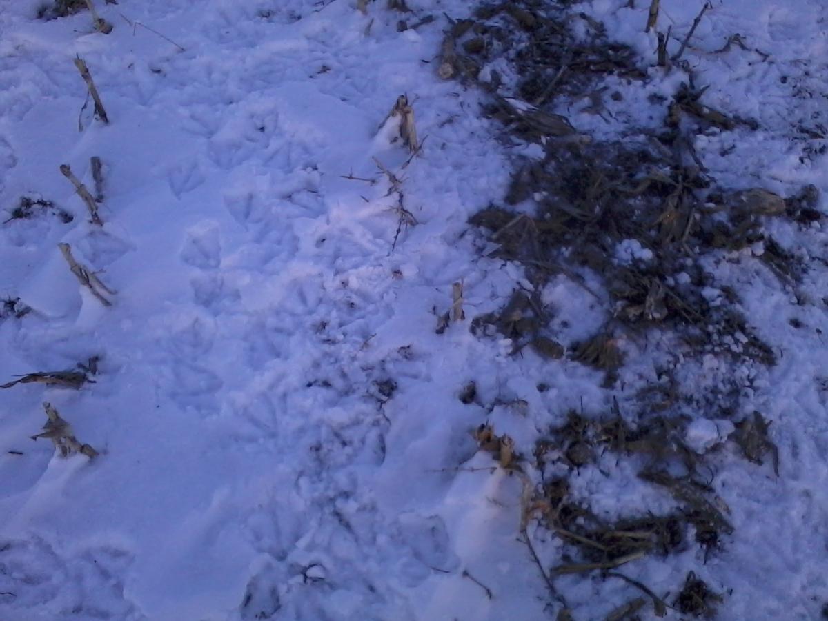 Мы, белорусы, под снегом. :ai: Но все равно выезжал в субботу на разведку на поля с надеждой в воскресенье поохотиться . Слой снега на полях порой достигал высоты 30-40 см. Правда гусь находил места на возвышенности, где снега так много не намело и жировал. В первый раз такое увидел на снегу и не смог не сфотографировать. Гуси находили рядок и вдоль по нему, как свиньи, чесали съедая все на своем пути. За воскресное время охоты с 6.30 до 10.20 видели несколько стай в 5-10 голов местных серых гусей, которые уже у нас третью неделю . Увы, мороз в 10 градусов внес свои корректировки - профили и оболочки обмерзали делая блики которые гуся отворачивали за 100-150 метров. Да и первых гусей увидели в 8.20, когда на фоне взошедшего солнца наши "лжегуси" блестели и сверкали, как новогодняя елка. Ни манок, ни манящий гуменник их не привлек. Сами же маскировались на снегу в белых маскхалатах и с белыми простынями. Вторые выходные без добычи, но с опытом.:cc: