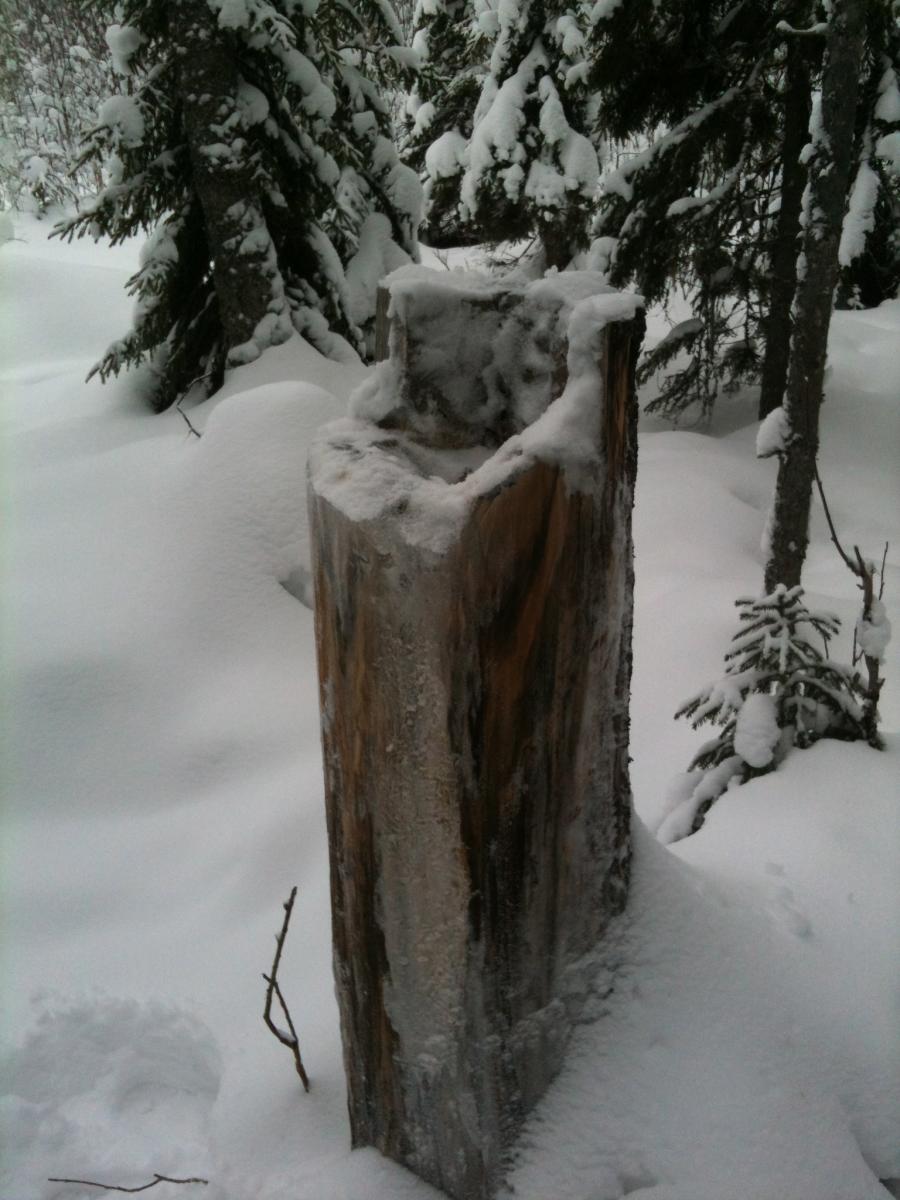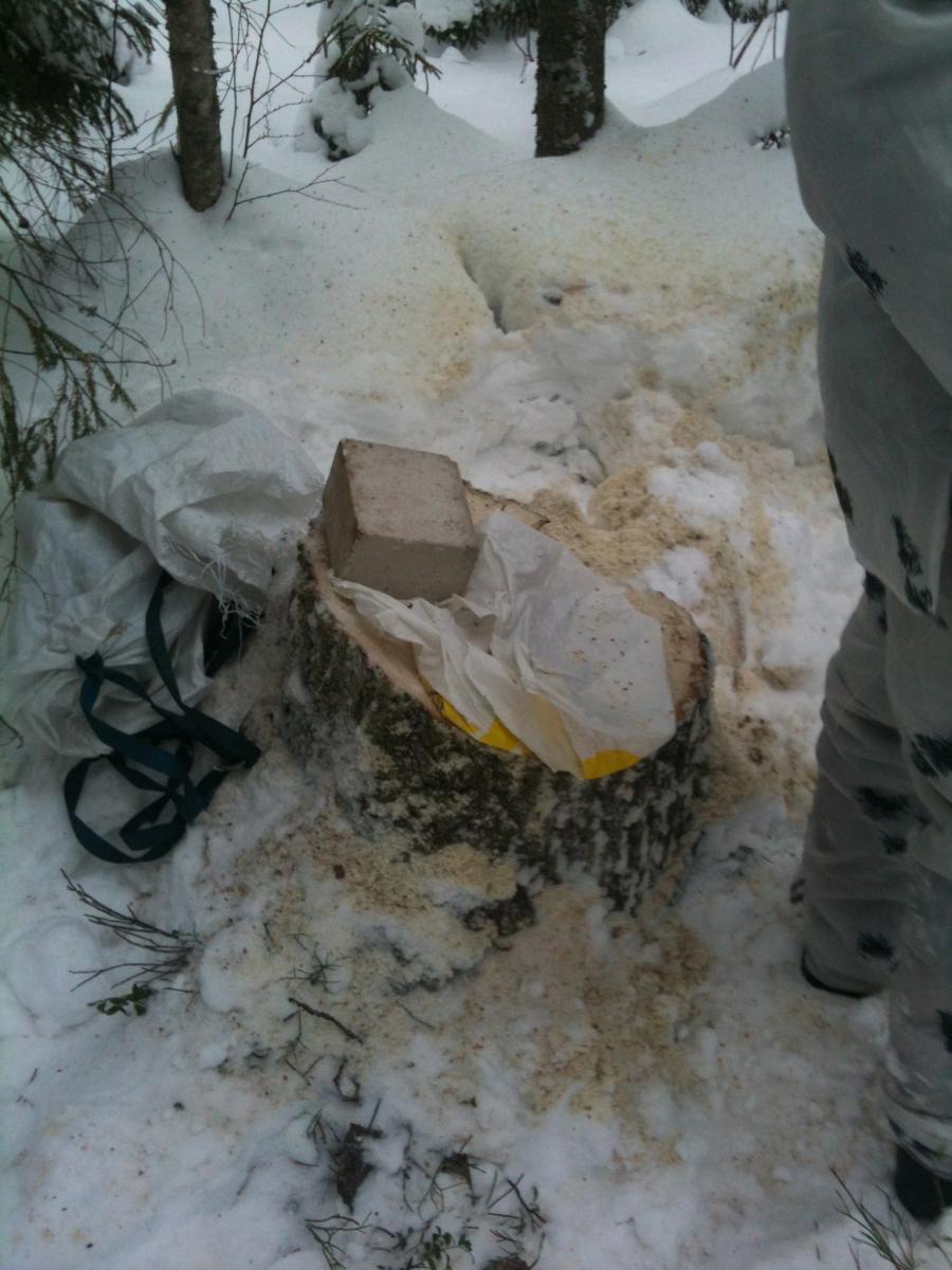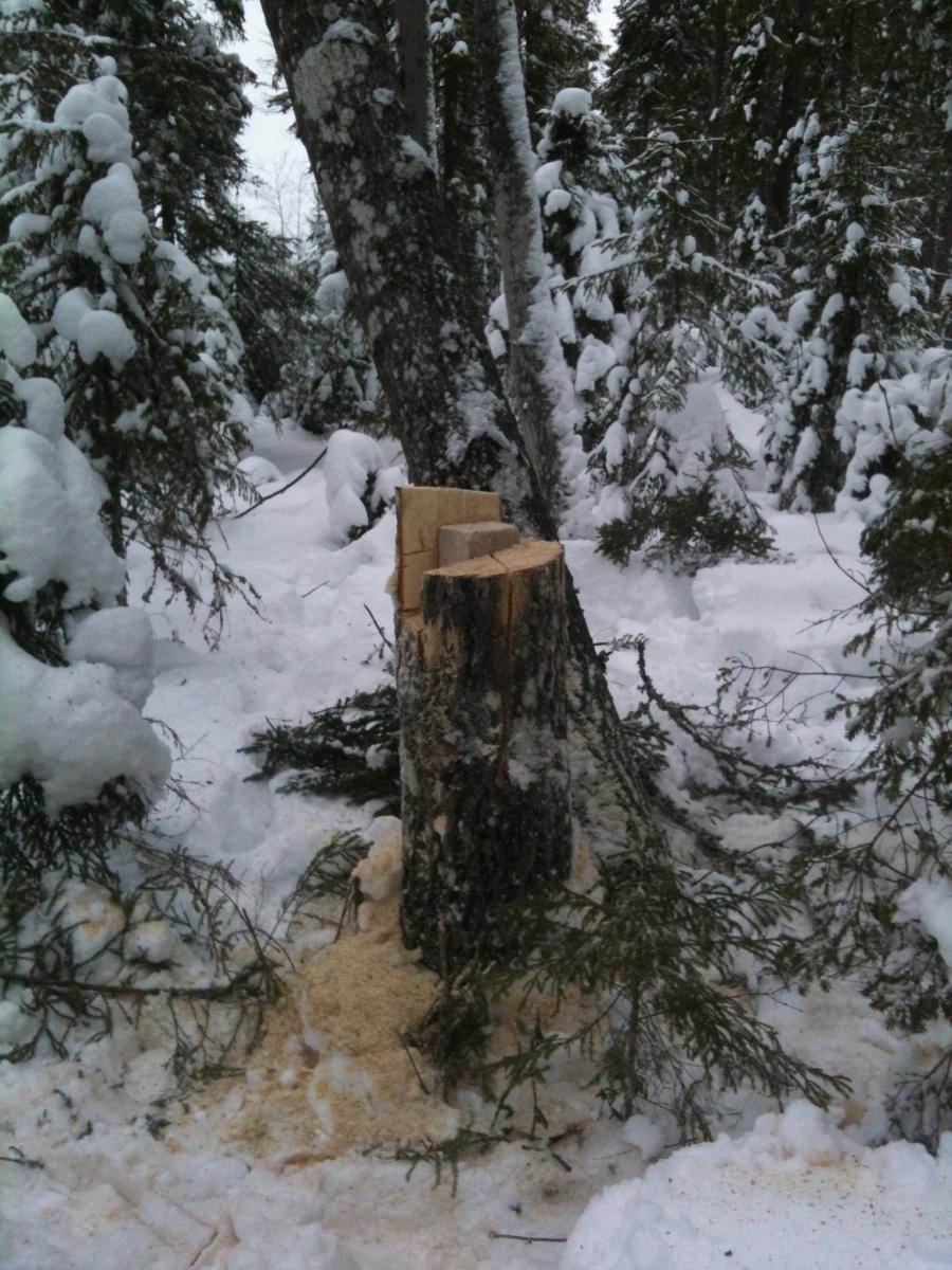 А праздник –это конечно выезд в родные угодья и поработать, и попытать охотЦкого счастья. Суббота выдалась распогодистой. Солнце напомнило о неумолимой весне. И даже полное отсутствие следов животинки в объездах и на деревьях на испортило радостной картины. И оставив ружья до весны, руки потянулись к бензопилам и брикетам с солью. До обеда двум мобильным группам удалось заделать два новых солонца в перспективных местах, а одному Форестмену, пешком на снегоступах,удалось добраться до рабочего солонца со свежей порцайкой кисляшки. Ну Леха(Форестмен) – ты просто сам как лось))).