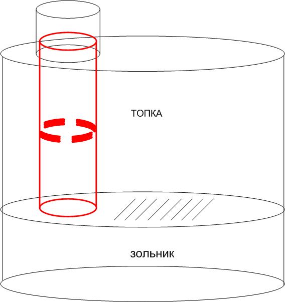 Идея видна из рисунка, труба ставится в печь без дополнительного крепежа и опирается на дно топки. Прорези в ней сделаны примерно в пол-высоты топки для образования кармана с горячими газами под "потолком" топки. Общее сечение прорезей должно быть в разы больше щелей в закрытой дверке топки + поддувала, иначе угорим...