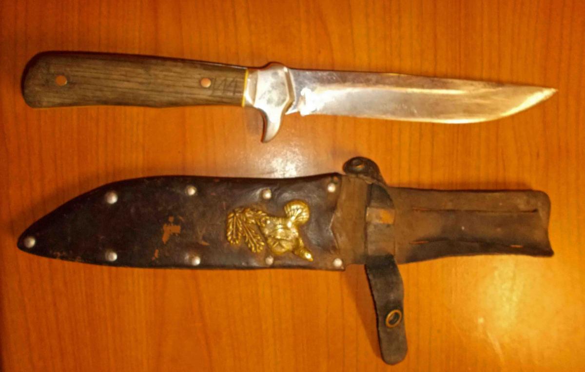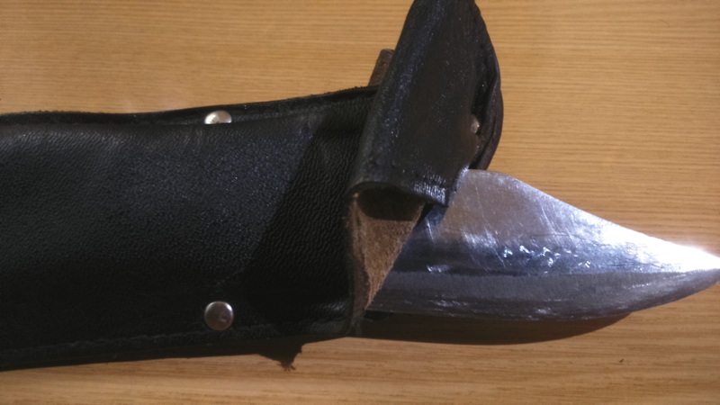 Сам понимаешь, такую "гирю" на шею лучше не вешать. Первый раз носить нож на шнурке через шею я попробовал только через год, когда мне сделали нож значительно меньшего размера. Сейчас этого ножа уже нет. Его сломал в тот же год один из моих гостей, который стал им щепу шепать и повернул на излом. Нож был изготовлен из клапана и сломался.