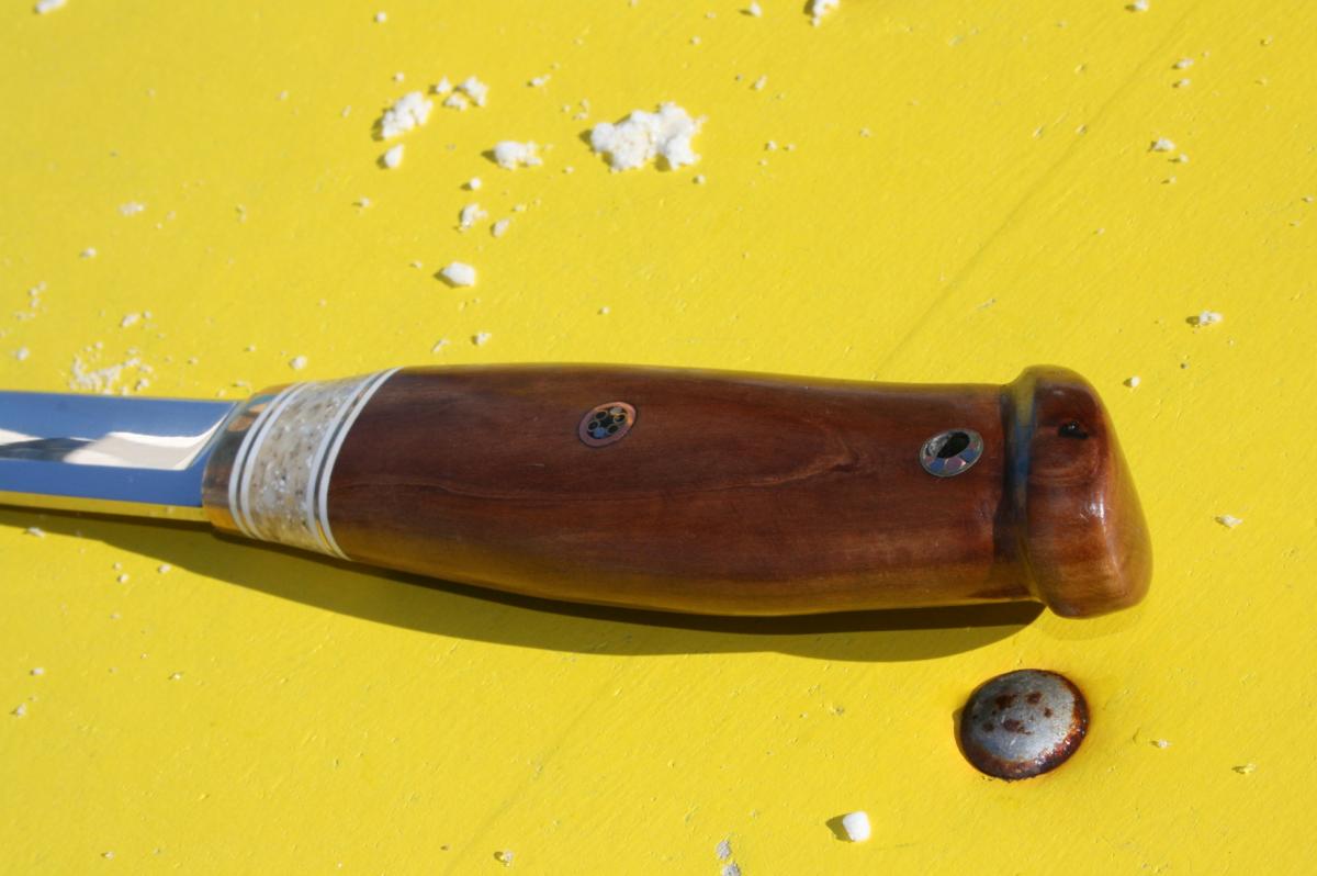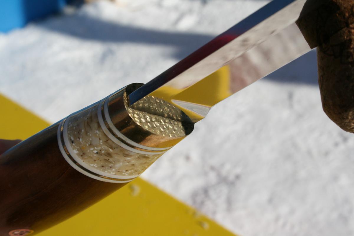 Рукоять бронза,латунь, фибра,искусственный камень Staron Tempest / цвет Rattan,дичок груши,тиковое масло+силиконовый шеллак,самодельные мозаик-пины.
