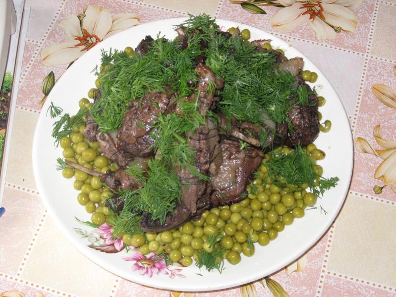 После этого достать дичь, освободить от ниток и сала и подать на стол с зеленым горошком и зеленью.