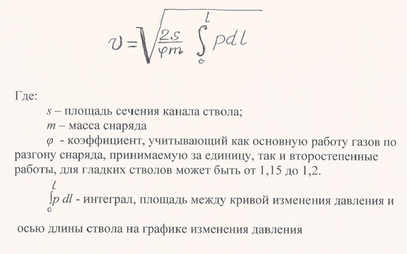 В формуле дульной скорости участвует коэффициент ФИ. Величина его для гладкого ружья не находится в пределах 1,15-1,2. При этом 1 – перемещение снаряда по стволу, 0,1 – отдача и стальной мизер – перемещение пороховых газов.