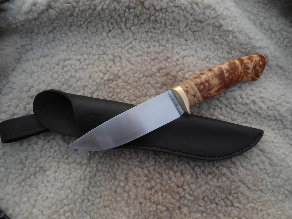 Вторй для рыбака Сталь 95х18 нержавейка твердость 58-59нрс. Клинок 152х26х4мм спуски прямые сведен примерно 0,3-0,4мм. Рукоять карельская береза,береста,кап березы 130х28х18мм. Ножны чепрак РД,подвес на левую сторону.