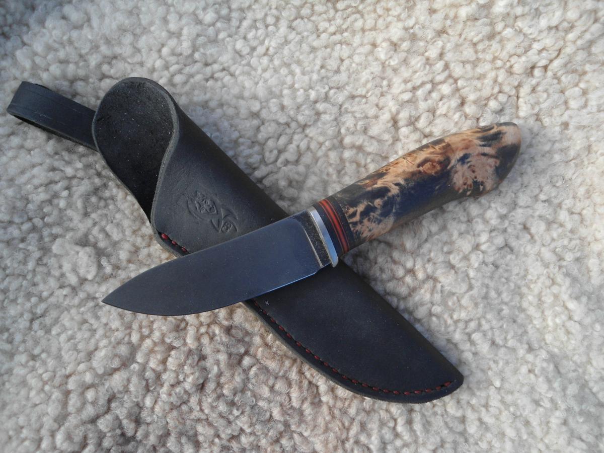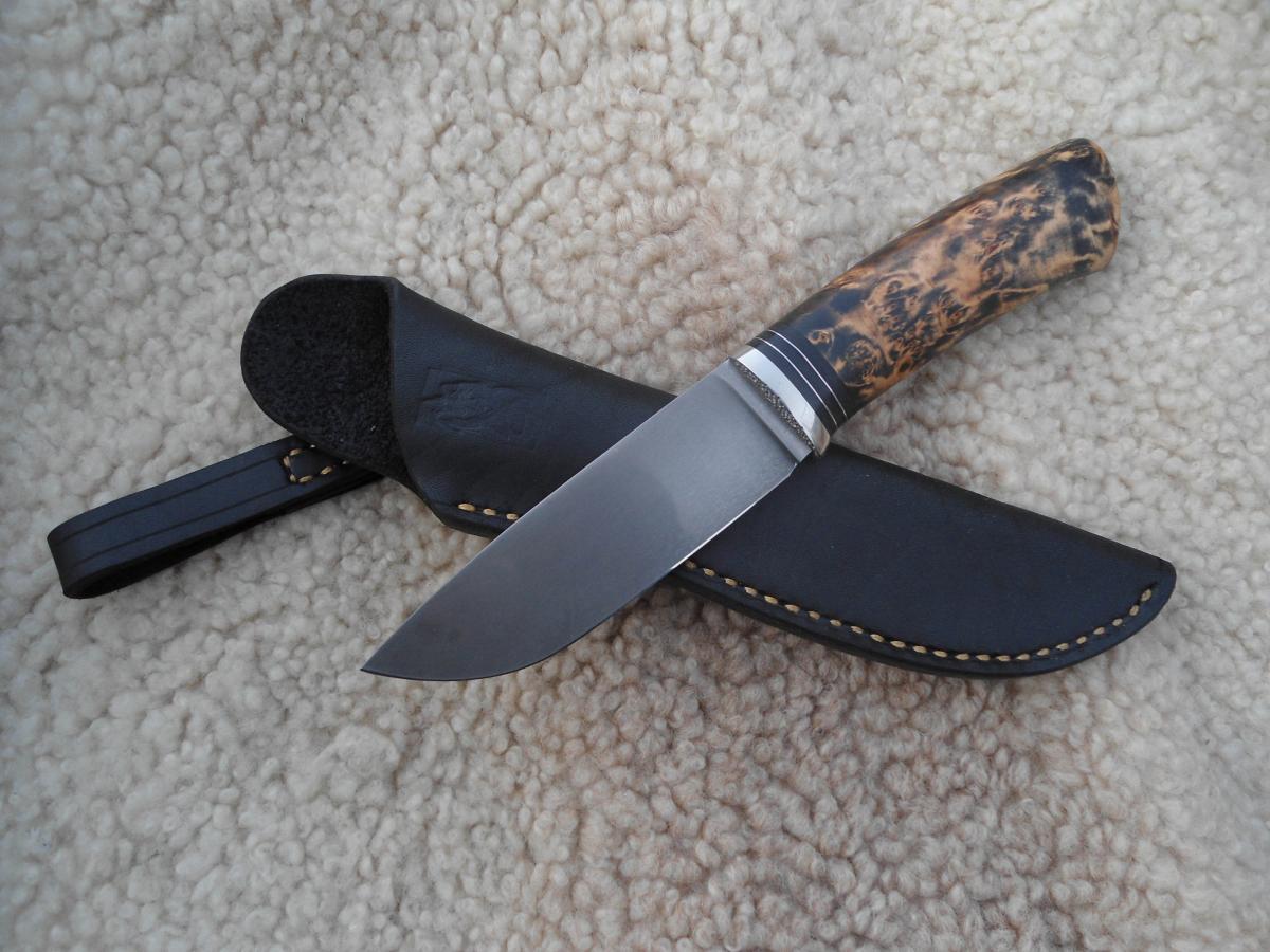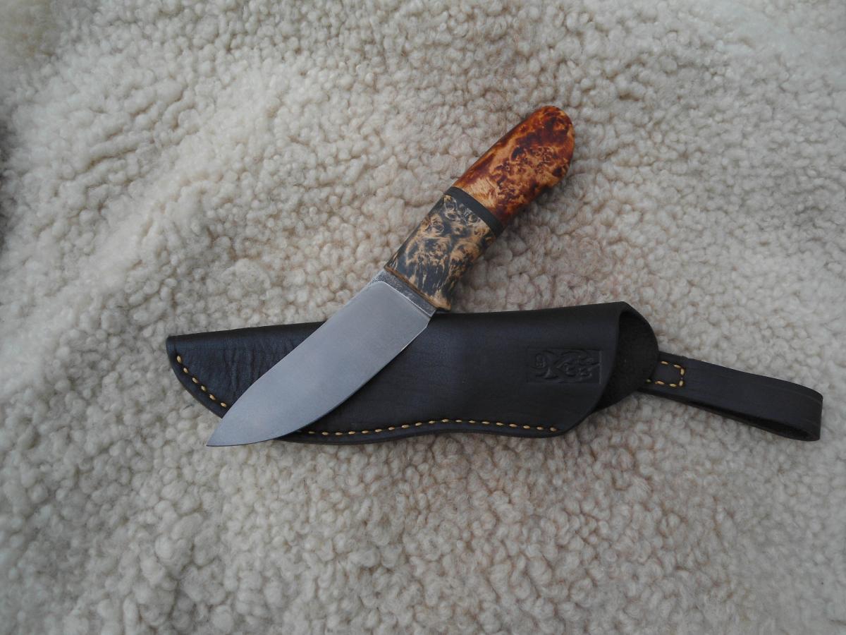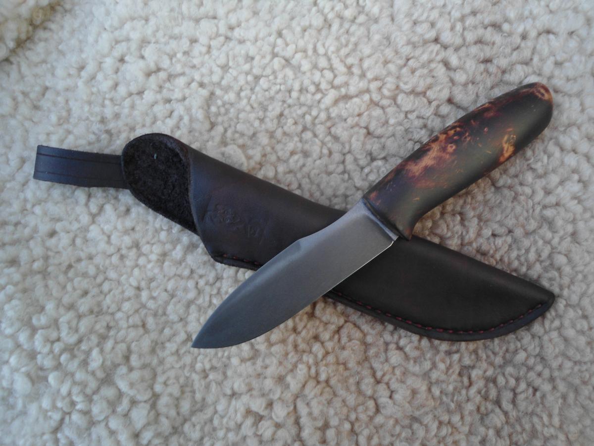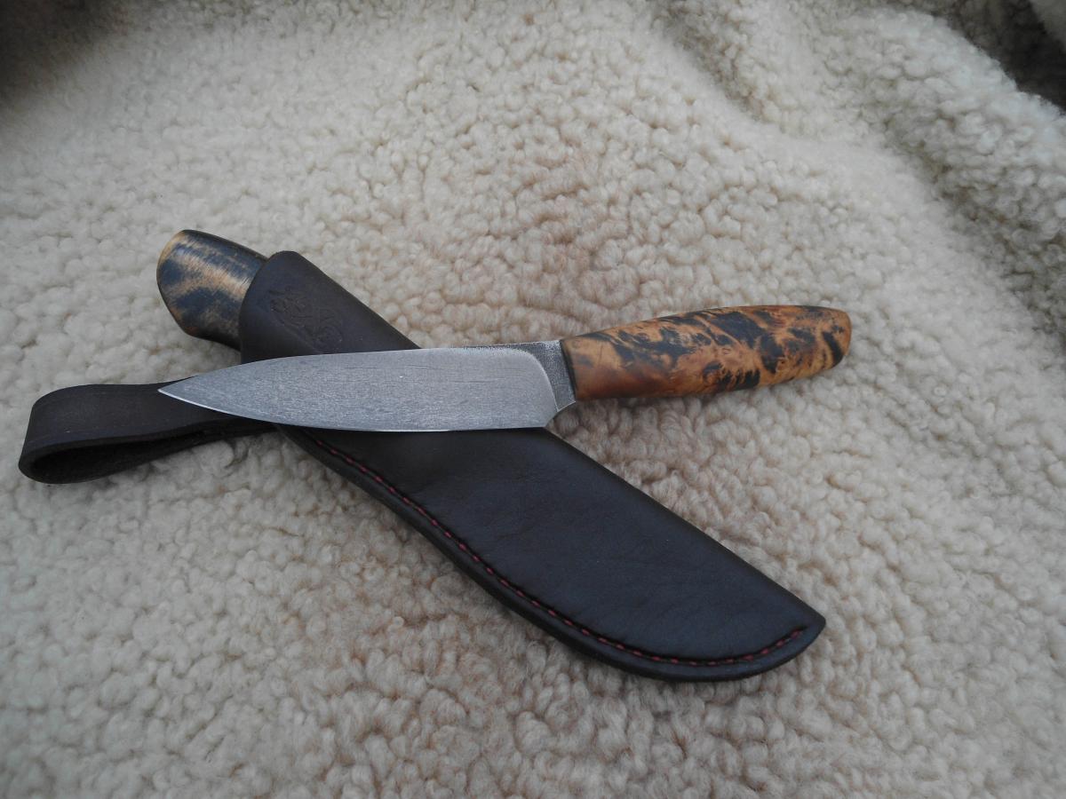 антипотеряшная,кап березы пропитан Тунговым маслом 108х21х14мм.Ножны чепрак шведский растительного дубления. Подвеса нет,сказал не нужно в кармане носить буду)))