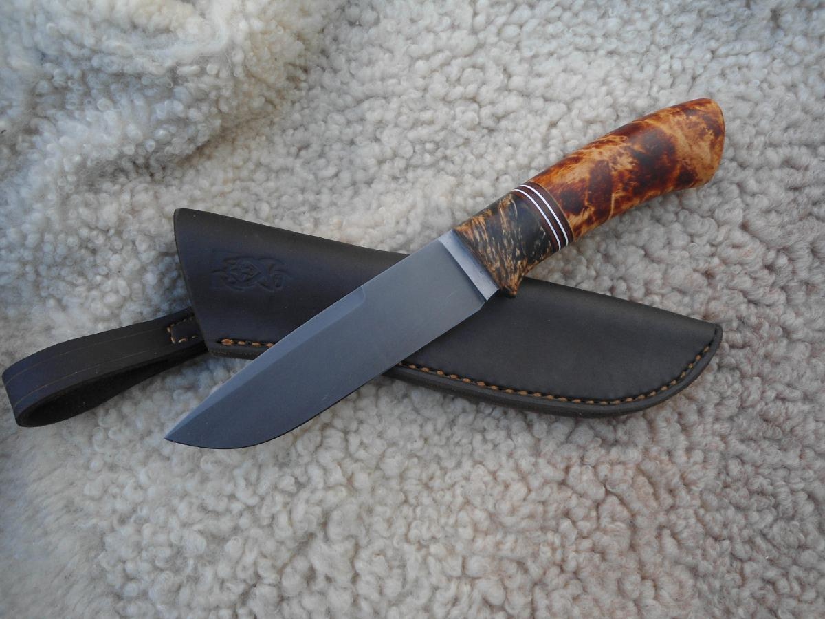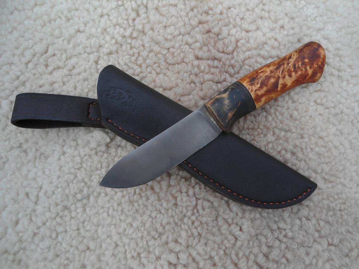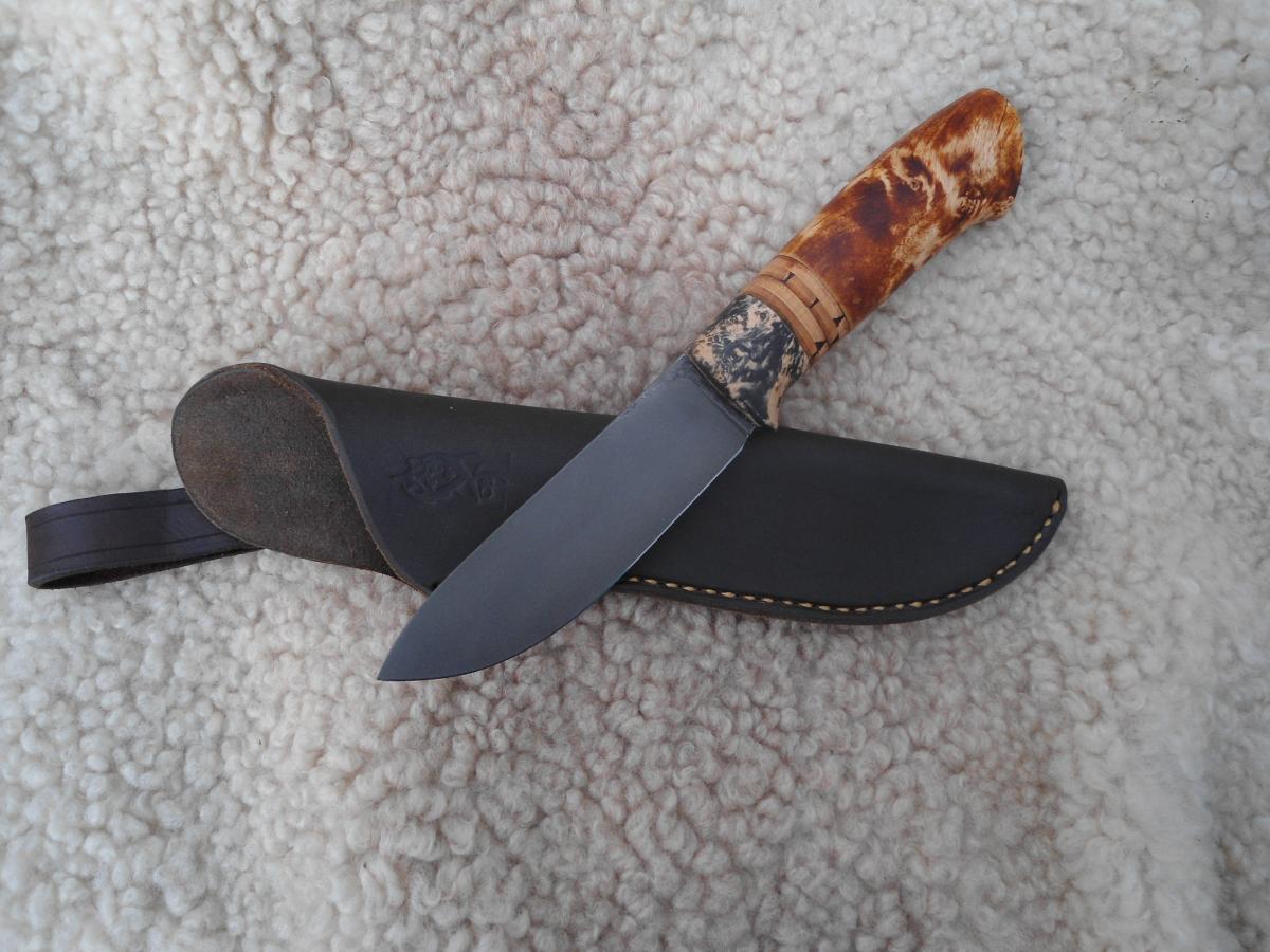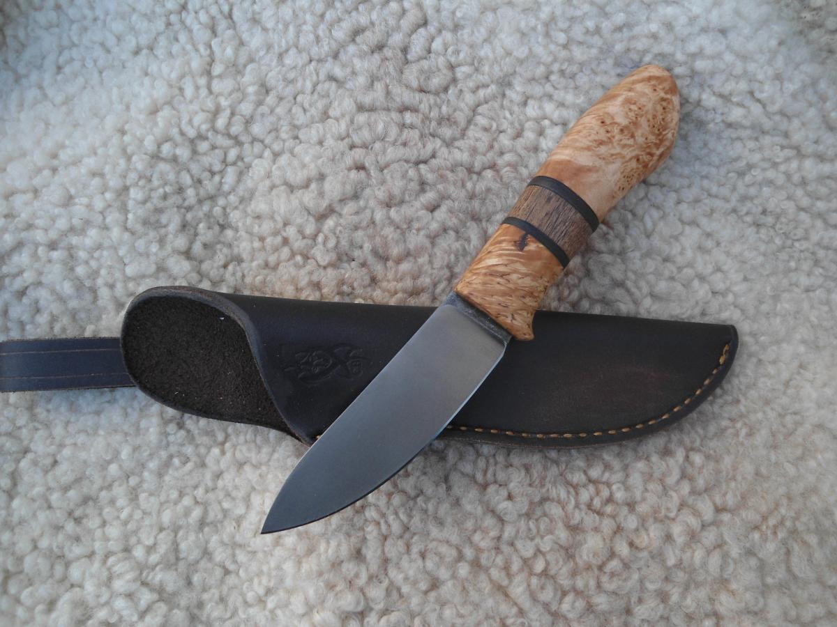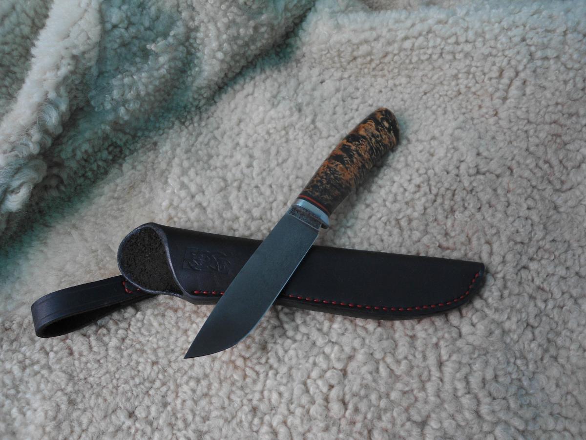 антипотеряшная,кап березы пропитан Тунговым маслом 108х21х14мм.Ножны чепрак шведский растительного дубления. Подвеса нет,сказал не нужно в кармане носить буду)))